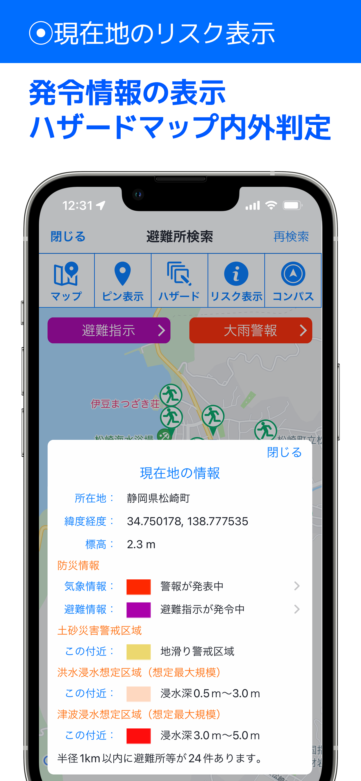 この新機能は、現在地の危険性を一元的に確認でき、避難所検索も現在地から近い順にリスト表示されますので、高齢者やアプリ操作に不慣れな方にも使いやすいシンプル機能です。
