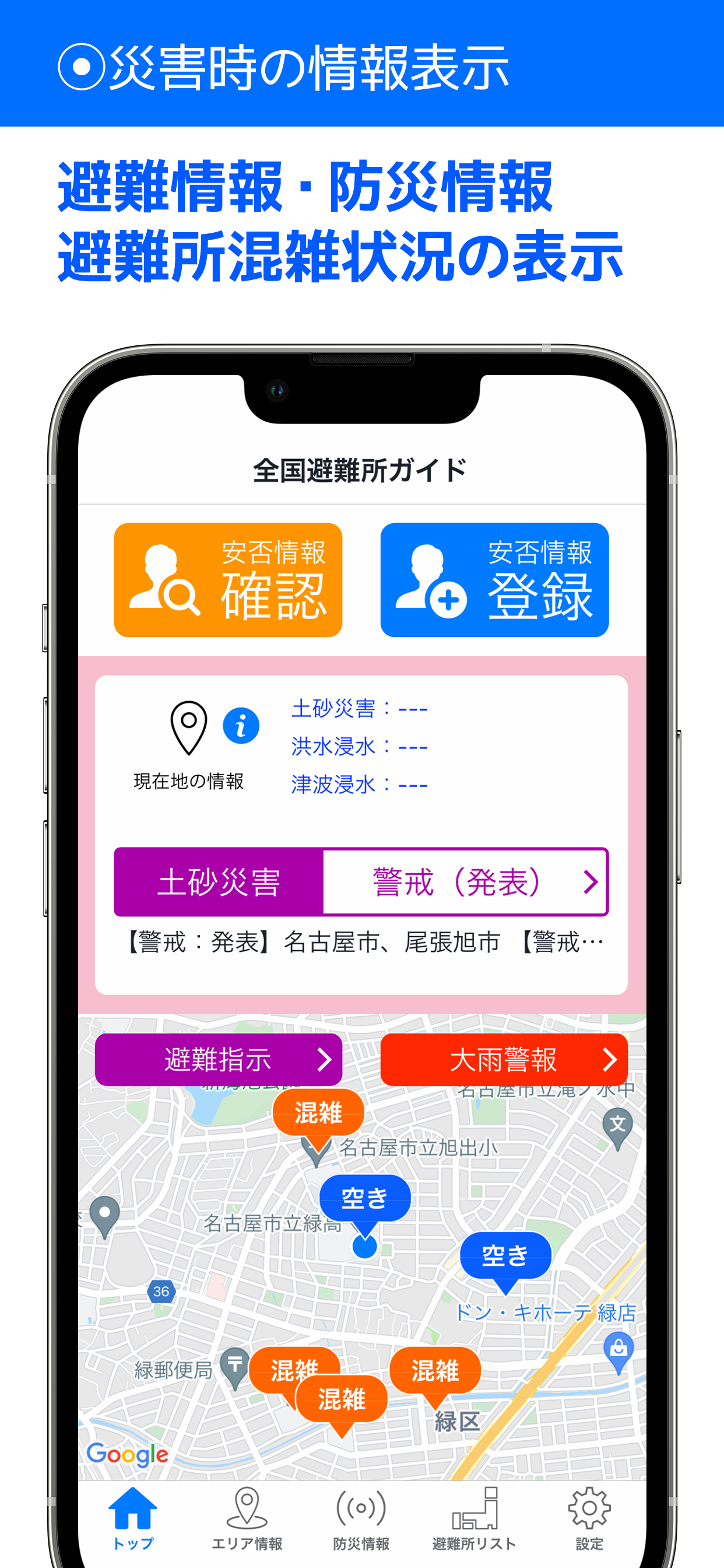 ・現在地に発表されている避難情報や気象庁防災情報を表示します。