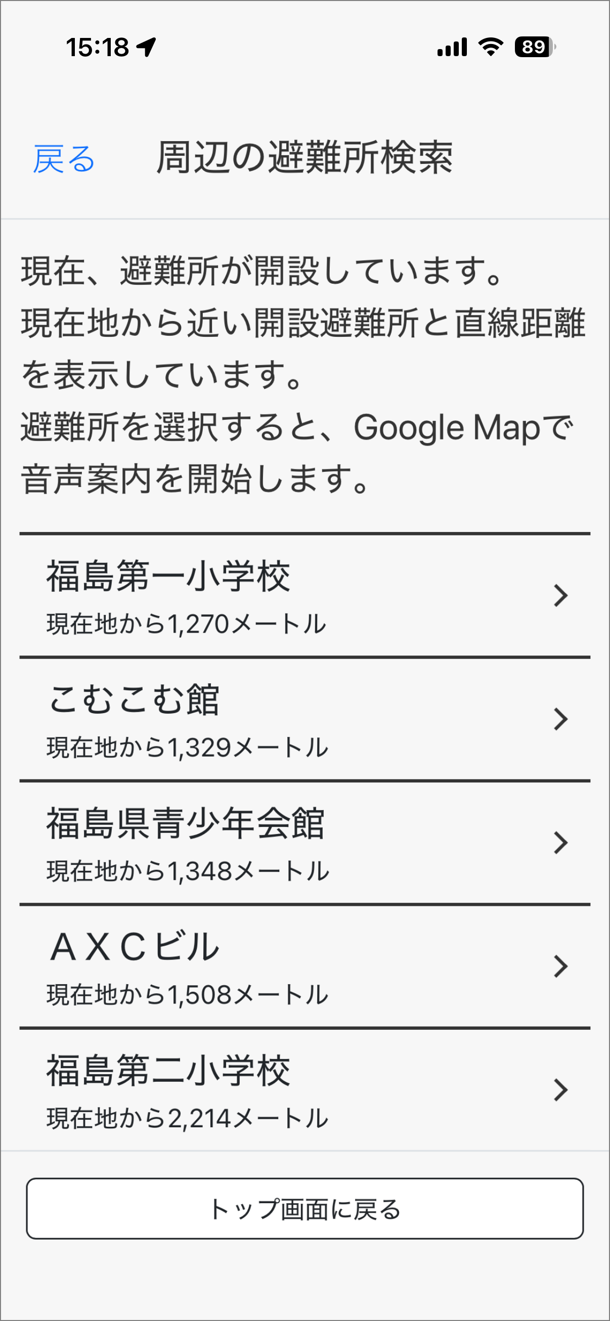 ・避難所リストを選択すると、Google Mapアプリで音声案内を開始します。