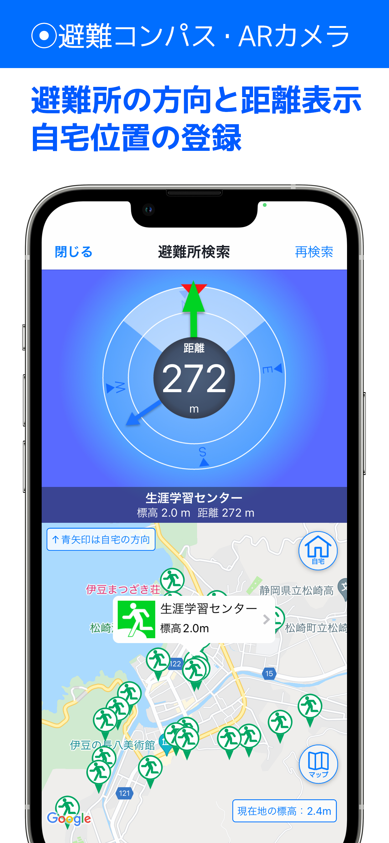 ・避難コンパス、ARカメラ機能を利用した避難行動支援