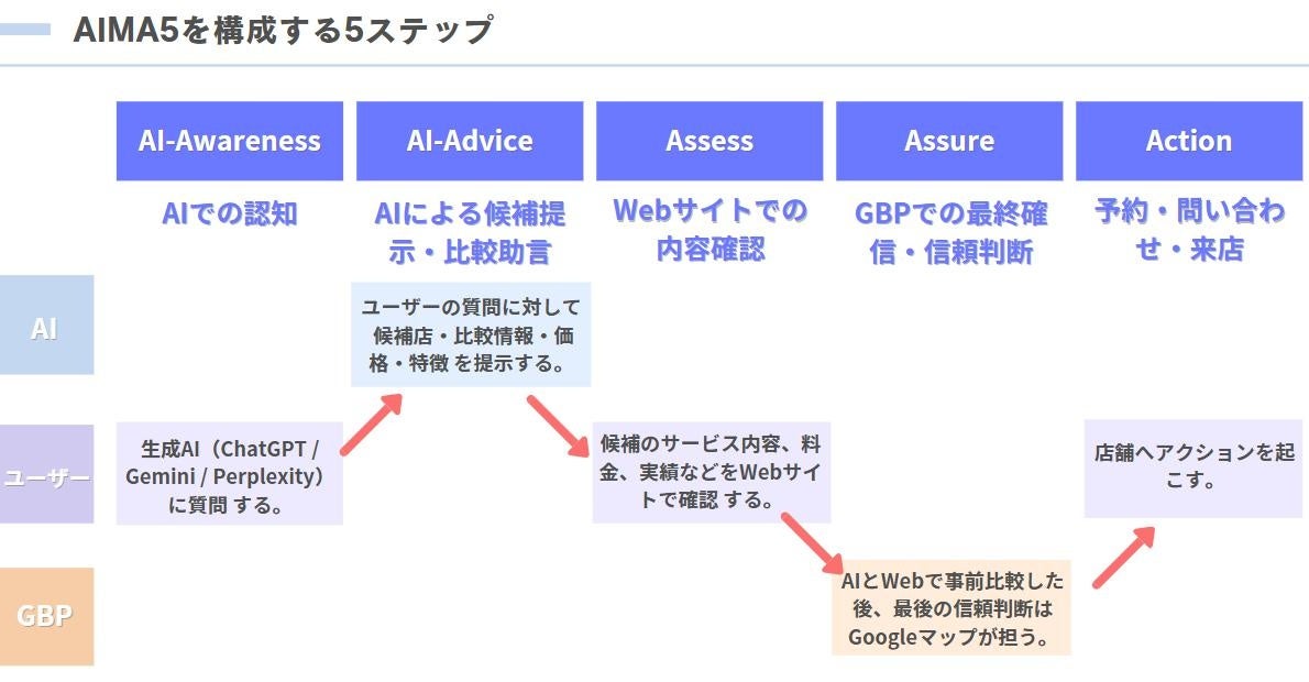 AIMA5は、AI検索での認知から、Webでの比較、Googleマップでの確信、来店・予約までの流れを5つのステップとして可視化したモデルのこと。