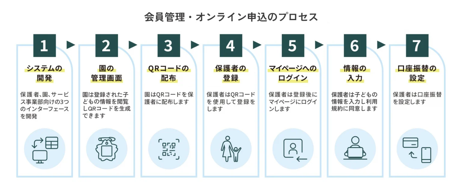 保護者は、子ども情報の登録やサービス利用申込、規約同意、口座振替手続き(印鑑不要)までをオンラインで完結できます。