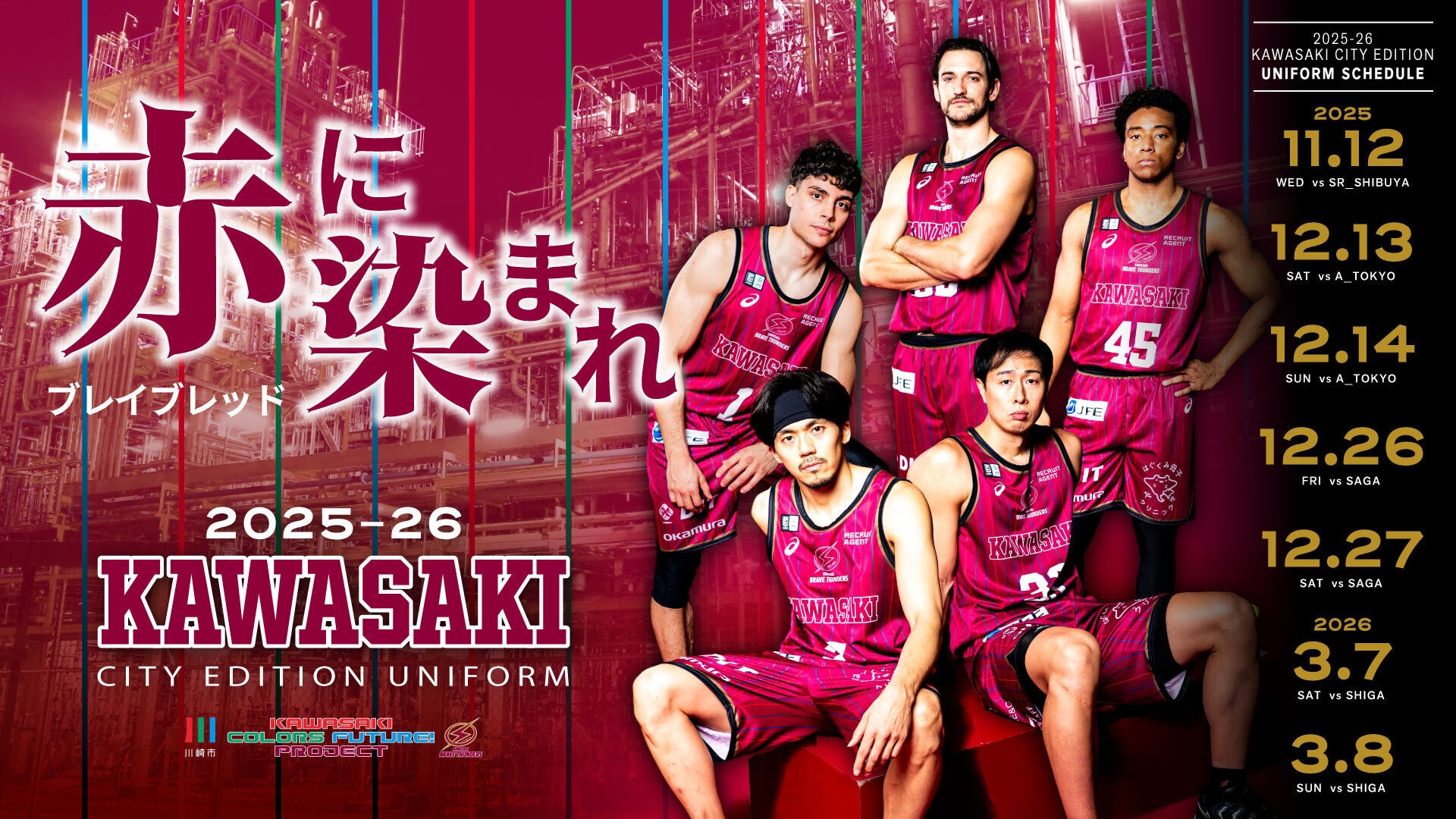 さらに、12月26日(金),27日(土)ホーム 佐賀バルーナーズ戦では、毎年恒例となる「KAWASAKI ENERGY DAYS(カワサキ エナジー デイズ)」を開催し、3rdユニフォームのデザインを踏襲したベースボールシャツを来場者へ配布することが決定いたしました。当日は選手も「”KAWASAKI” CITY EDITION UNIFORM」着用し、選手と来場者がともに「KAWASAKI」を纏い会場を赤く染めて戦います。
