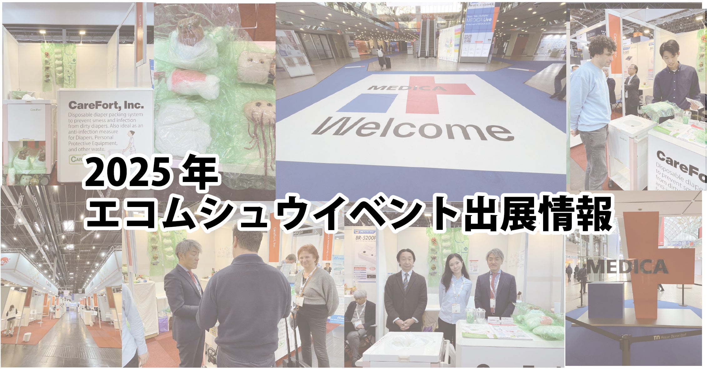 ケアフォート株式会社(本社:東京都千代田区、代表取締役:春山泰三)が2025年に16のイベントに「エコムシュウ」を出展いたしました。一人でも多くの医療・介護従事者の方々に実際の機械を見て頂き、においが漏れない特殊なテープを実際に体感頂く事を目的に医療介護系展示会及び医療系学術集会企業展示に出展しております。5月に看護フェア、9月末には大阪・関西万博、11月はドイツで行われたMedica2025に出展し多くの国の方々からも「エコムシュウ」システムをご評価いただきました。来年以降も沢山のイベントに参加する予定です。