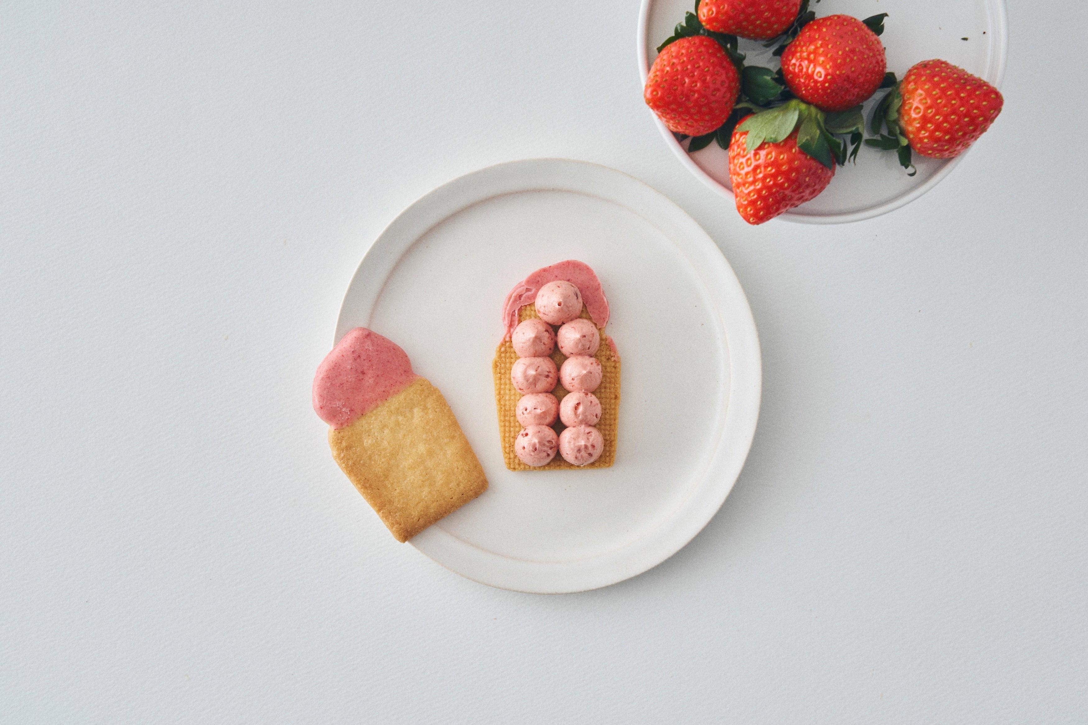 赤:いちごラズベリー生バターサンド生クリーム入りのバタークリームに甘酸っぱい自家製いちごラズベリージャムを合わせ、いちごチョコレートをかけたビスケットで挟みました。フルーティーでジューシーな味わい。華やかなピンク色の可愛い見た目。さっぱりとしながらも、重厚感のあるミルキーな食べ心地です。
