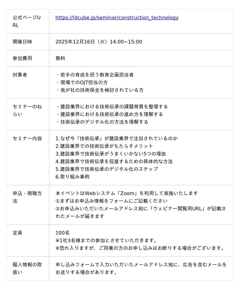 研修のスタイルにとらわれない企業向け人材育成サービスを提供する株式会社LDcube(本社:東京都千代田区、代表取締役社長:新井澄人、以下「当社」)は、「【建設業界向け】研修・OJTに依存しない技術伝承とは若手を即戦力に育てるデジタル化のポイントを解説!」と題してウェビナーを開催しますので、お知らせします。