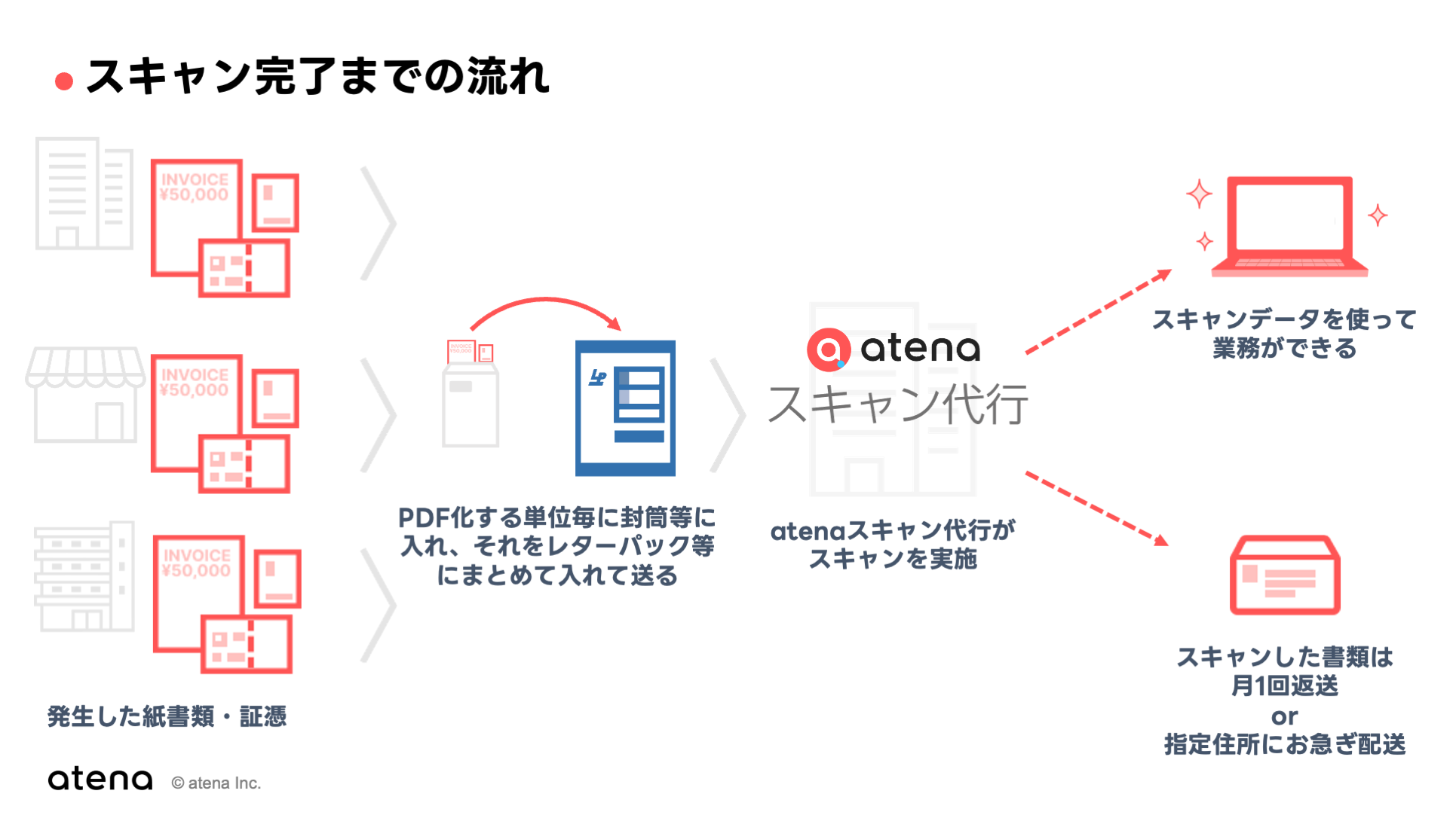 月額5,000円(税抜/250ページまで)から利用できる料金体系で、中小企業や小規模税理士事務所などでも導入可能です。また、スキャンした書類や証憑を返却するだけでなく、指定住所への配送や、atenaによる長期保管(有料オプション)にも対応しています。