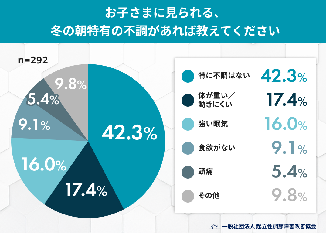 → 8割超の家庭で冬の「起き渋り」増加を実感。 日照時間の短さや気温低下が朝の立ち上がりに影響している可能性が示唆されます。