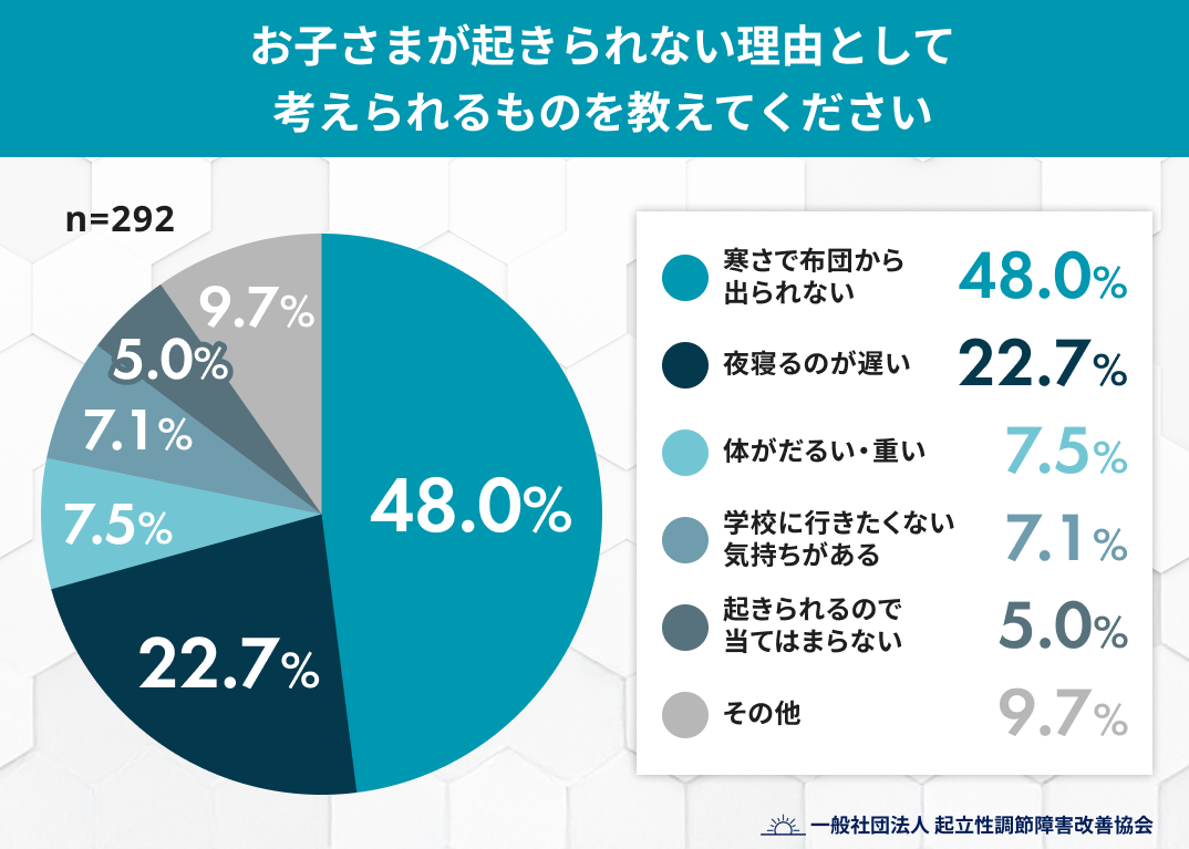 - 冬に「起きられないことが増える」家庭は82.9%- 起きられない理由の1位は「寒くて布団から出られない」で約半数を占める