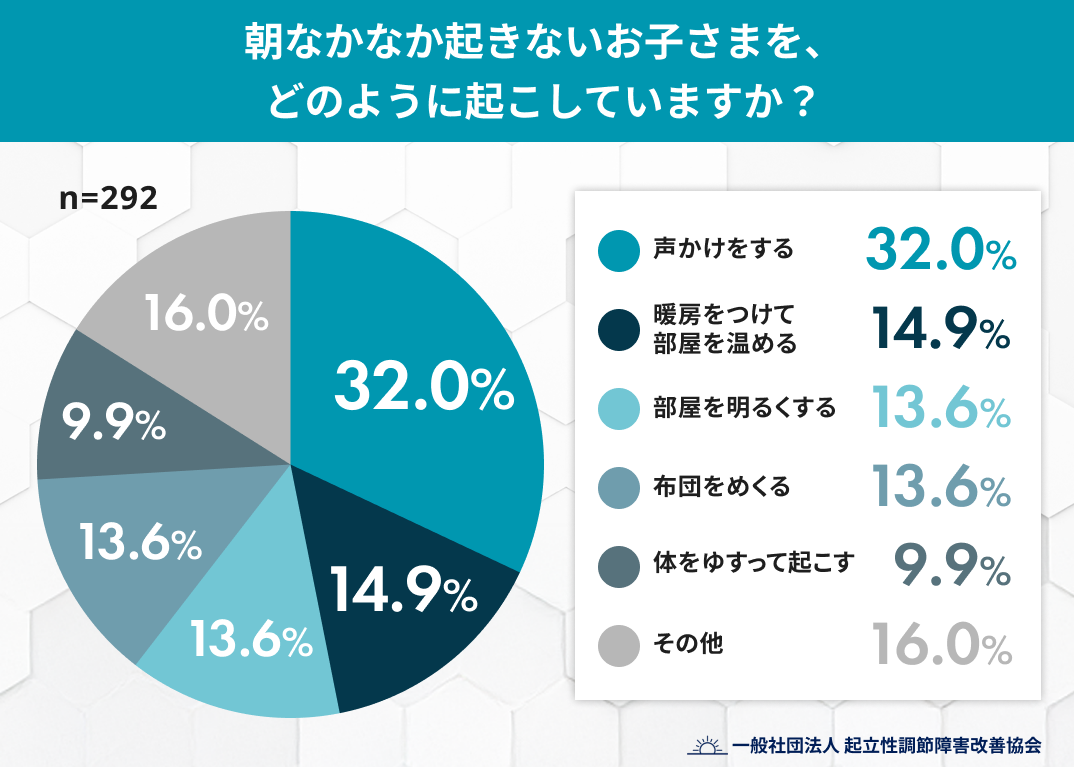 - 家庭での起こし方は「声かけをする」が最多、「部屋を暖める」などの工夫も見られる