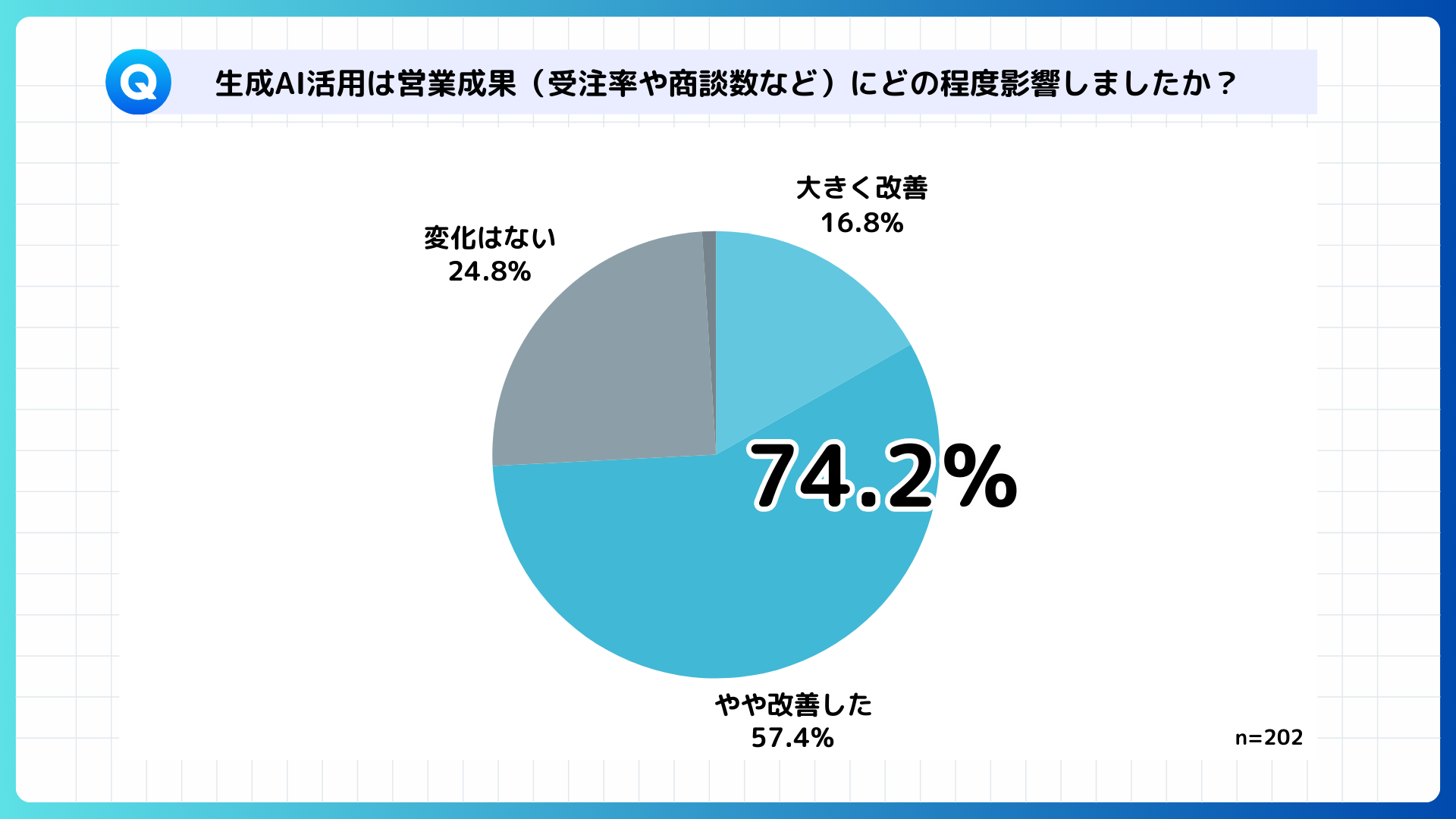 1. 生成AI活用者の約7割(74.2%)が営業成果の改善を実感。生成AIを日常的に使う営業ほど効果が大きい傾向