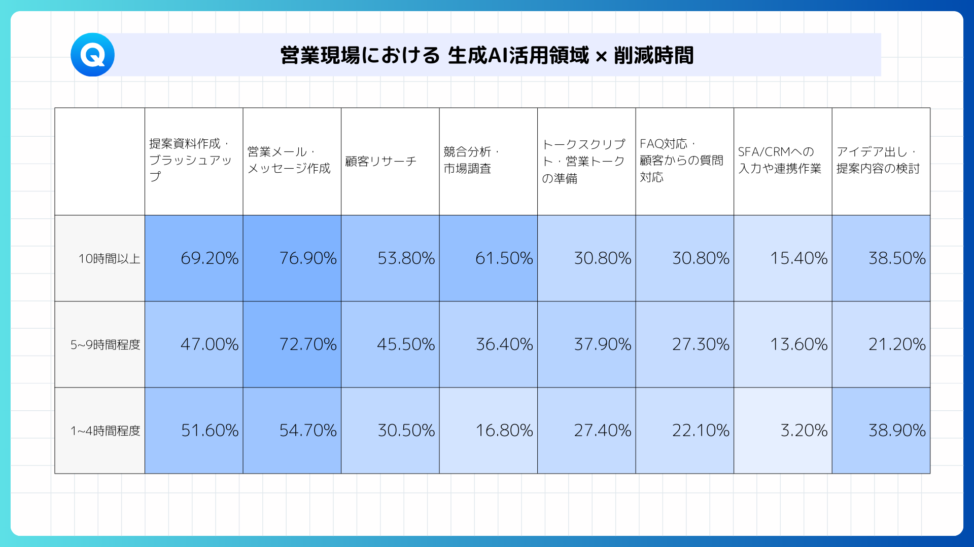生成AIの活用シーンは「営業メール・メッセージ作成」(60.0%)、「提案資料作成・ブラッシュアップ」(48.8%)が上位を占め、文書作成領域に利用が集中。活用者の86.1%が「週1時間以上の業務時間削減」を実感しており、反復的な文章作成業務で即効性の高い効果が見られました。