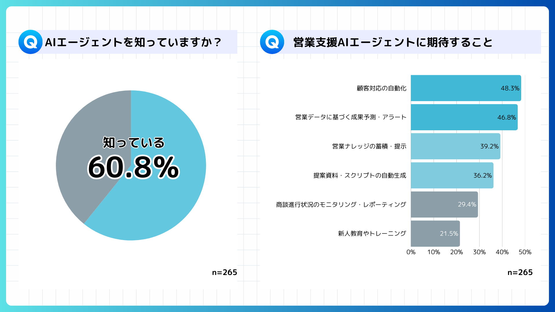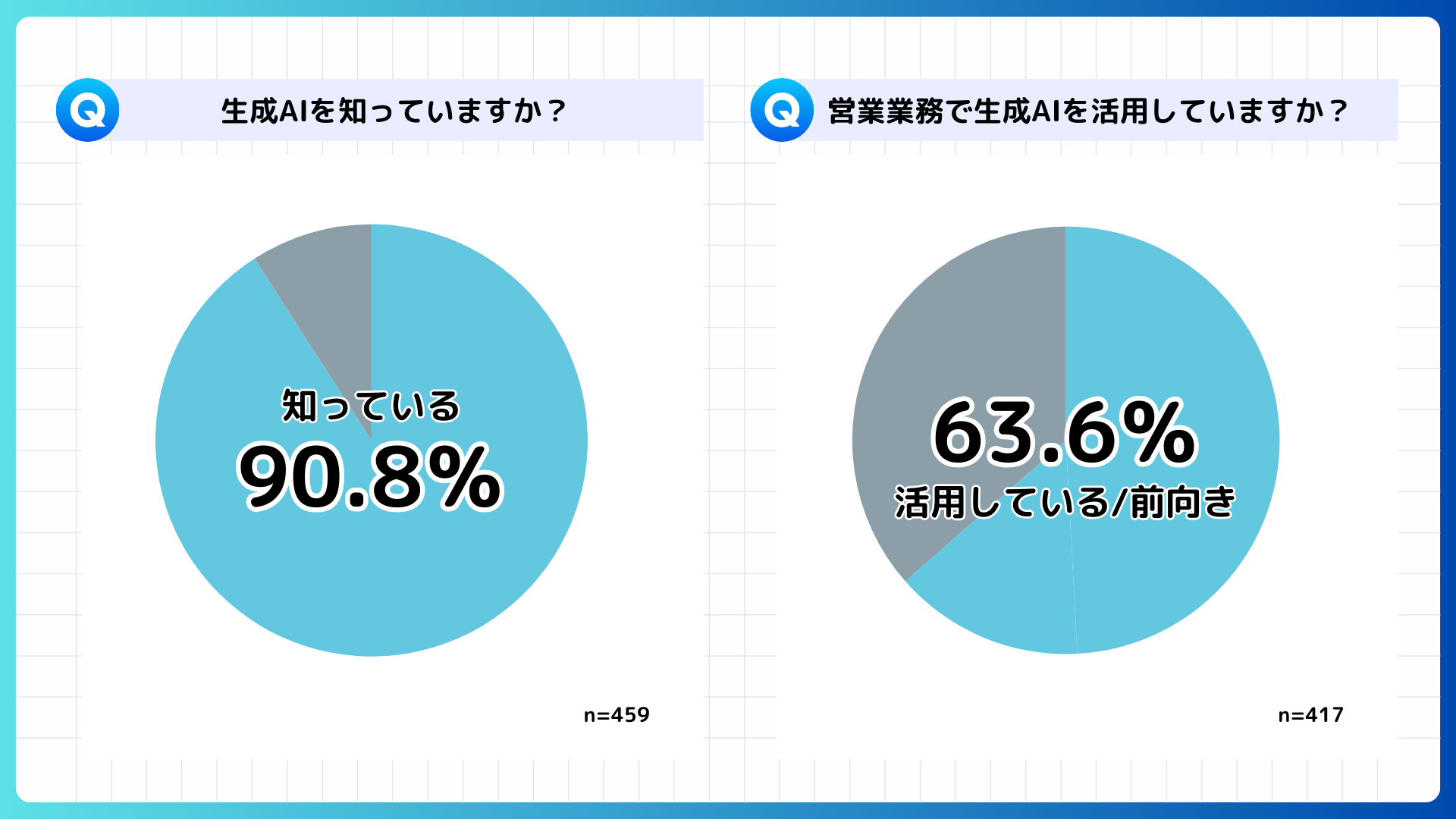 生成AIが急速に普及するなか、営業職の90.8%が生成AIを認知し、活用者の約7割が「営業成果が改善した」と回答する一方、「情報の正確性」や「セキュリティ・情報漏えいリスク」、社内ルール未整備などの組織的課題も明らかになりました。また、AIエージェントの認知は6割、導入に前向きな層は8割超にのぼり、営業現場では「文章生成」から「業務プロセス全体を支援するAI」への期待が高まっていることが分かりました。
