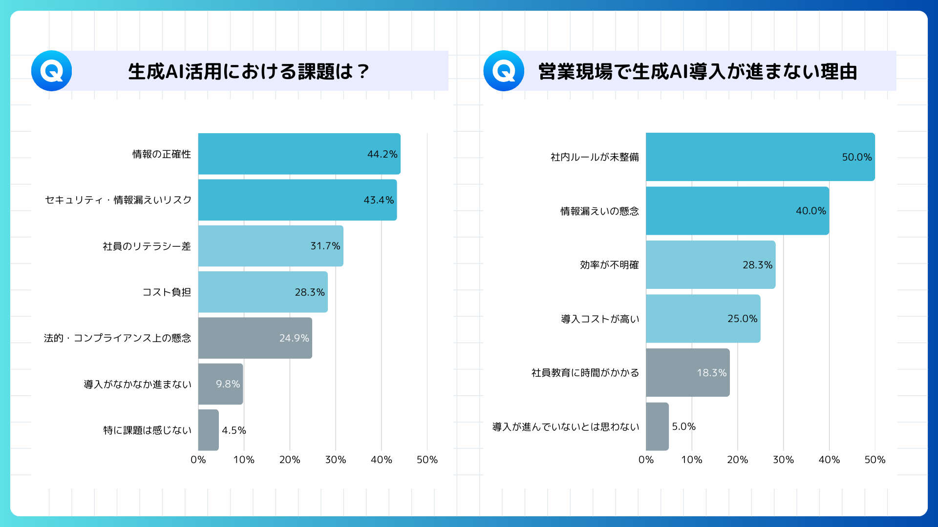 生成AIは営業現場で確かな成果を生み始めています。その一方で、「正確性」や「セキュリティ」への不安が、次の活用フェーズを止めていることも明らかになりました。