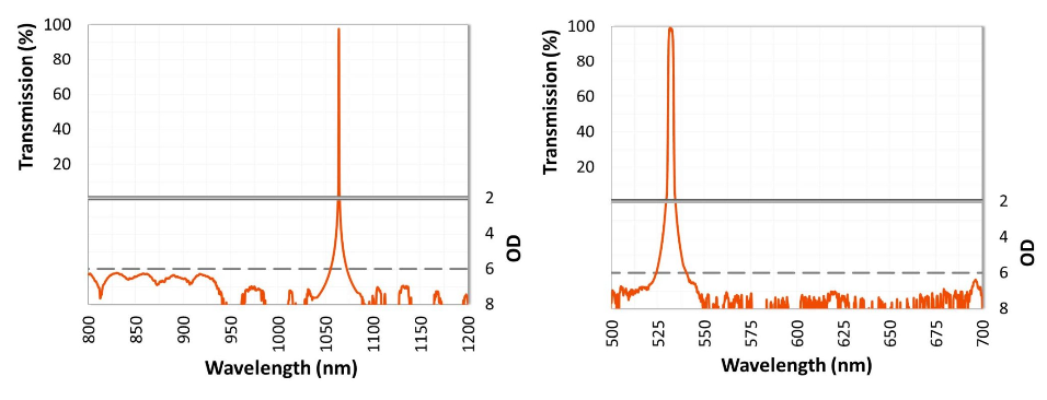 超狭帯域フィルター(1064 nm Nd:YAG レーザー使用条件、 OD6 ブロッキング