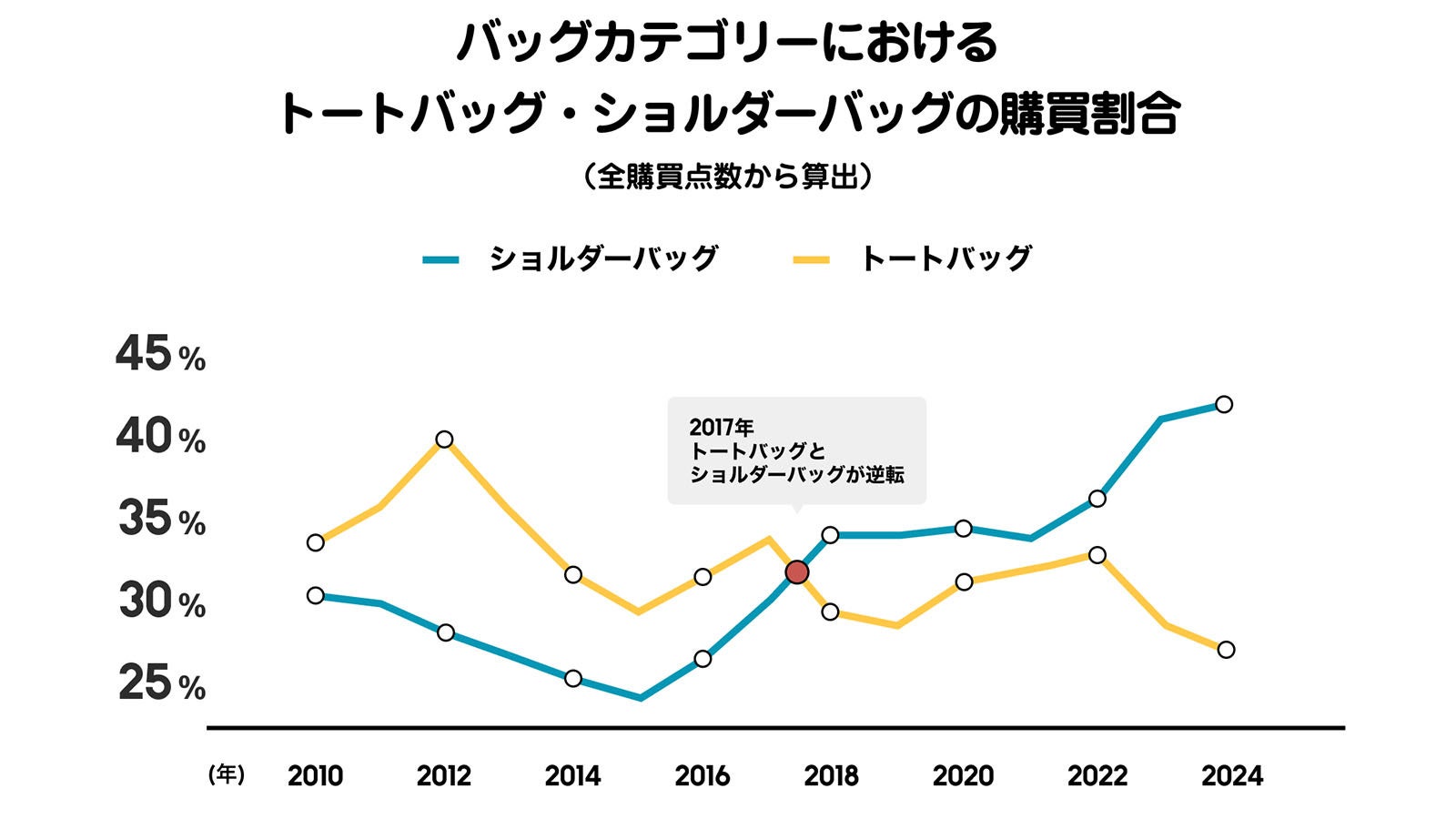 この20年間で、働き方やライフスタイルが多様化するなか、バッグやシューズアイテムの人気傾向にも変化が見られました。バッグカテゴリーでは2010年代以降、トートバッグの販売構成比が約15ポイント減少した一方で、ショルダーバッグが約20ポイント増加。手が自由に使える“肩掛けスタイル”が選ばれる背景には、スマートフォン操作の増加や移動中の使いやすさを重視する行動の変化があると考えられます。また、シューズカテゴリーでは、スニーカーやサンダルの販売構成比が20年前から約30ポイント増加。特に2020年代には、コロナ禍を経て通勤スタイルのカジュアル化が進み、仕事中にスニーカーを履くことも多くなっているようです。リカバリーサンダルの人気も後押しし、快適さを重視する傾向が定着しつつあります。