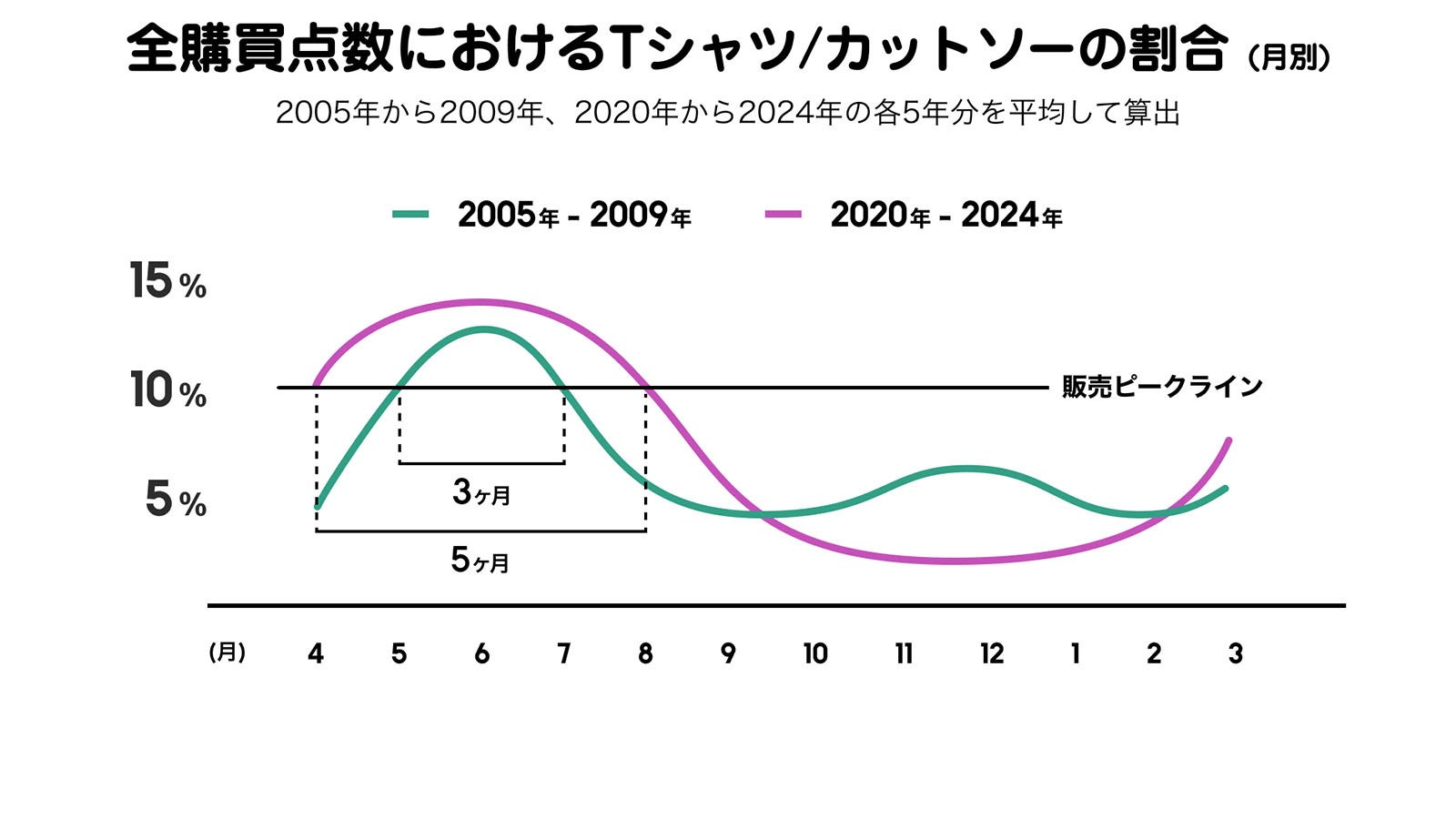 気象庁の観測によると、この20年間で日本の平均気温は約1℃上昇しており、夏日や真夏日の増加により、ファッションの季節感にも変化が起きています。2000年代前半は5~7月に販売ピークを迎えていたTシャツ/カットソーは、2020年代では4~8月に前倒し。販売ピーク期間は平均で約2か月以上拡大するなど、“シーズンレス化”の兆しが見られました。一方で、アウターの販売ピークは、2000年代前半の10月~1月から、2020年代では11月~1月と約1か月間短縮しました。気候変動がファッションの購買行動にも影響を与えていることがうかがえます。
