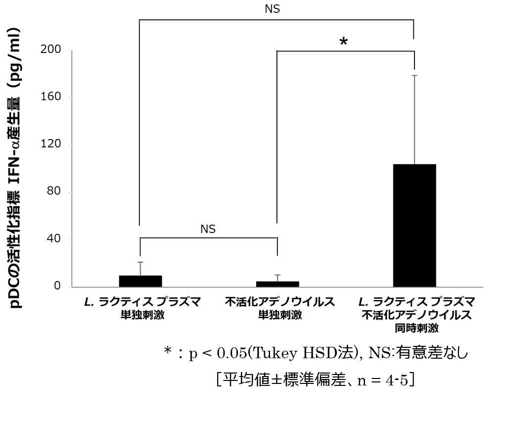 「L.ラクティス プラズマ」のpDCに対する同時刺激が、アデノウイルスに対する抗ウイルス性物質の産生量を有意に上昇させることが確認され、「L.ラクティス プラズマ」の同時刺激により、アデノウイルスに対する抗ウイルス応答が速やかに誘導されることが示唆されました。