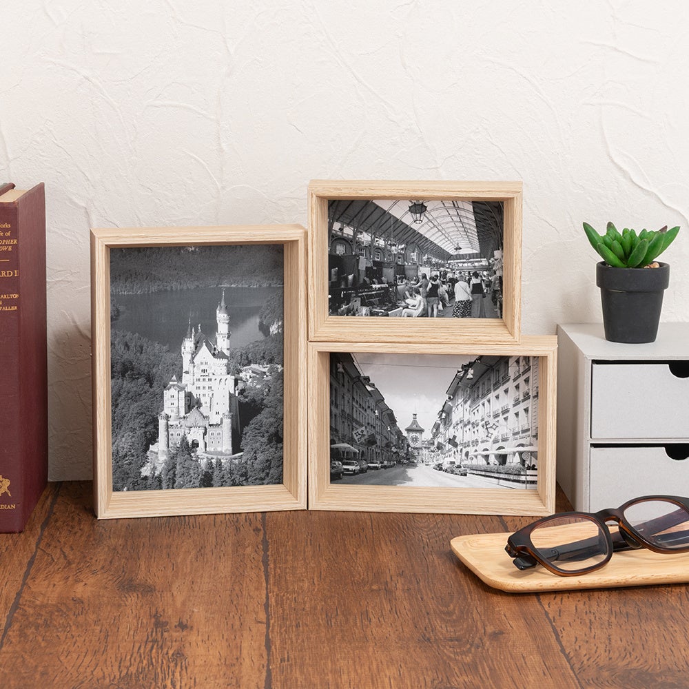 - Lサイズ(127×89mm)、KGサイズ(152×102mm)、2Lサイズ(178×127mm)の写真に対応- フレーム幅は細めで奥行きのある形状。スタンド無しで自立