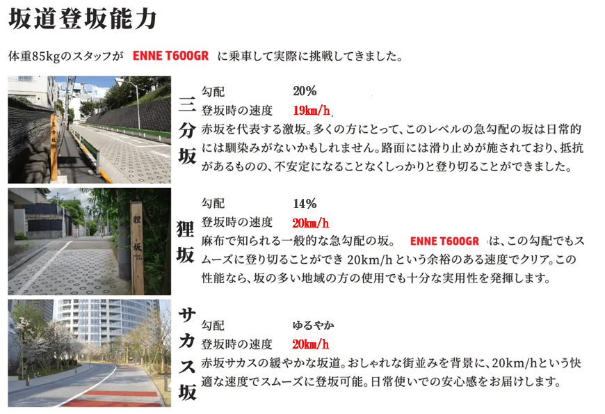 下図は坂道別の実測データです。T600GRは最も急激な三分坂ですら85kgのスタッフが乗車して19km/hの速度で登りきることができました。