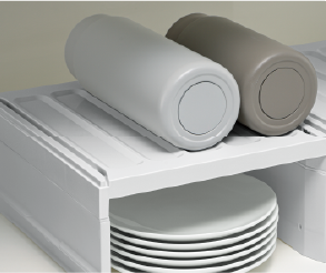 「吊り戸棚用 食器ストッカー」は食器などをキレイに整理整頓するのに便利で、平積みにした皿が取り出しにくいというユーザーの声に応え、使いたい食器をすぐに取り出せるように収納できる商品です。また天板が波型形状の回転ガード付きなので、水筒などの円柱形のボトルも転がらずに横置きできます。マルチストッカーと食器ストッカーそれぞれレギュラー、ワイドの2サイズ全4アイテムを取り揃えました。