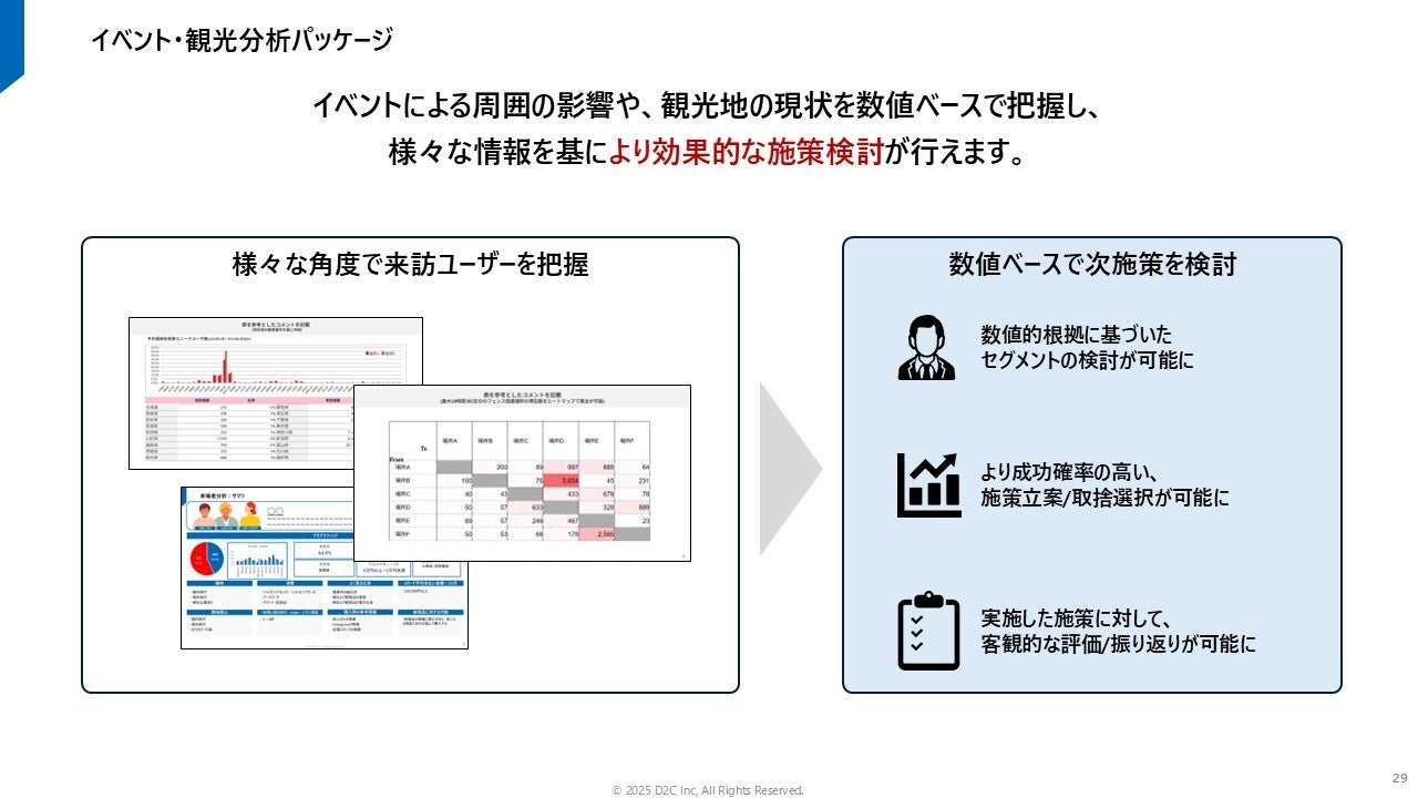 - 地方自治体・DMO:イベント終了後の継続的な観光誘致施策立案のため、来場者の特徴を分析し、新たなターゲット層へのアプローチを検討。
