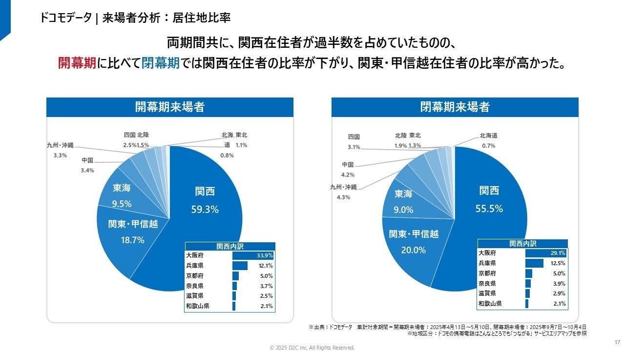 株式会社 D2C(本社:東京都港区、代表取締役社長:高田 了、以下D2C)は、株式会社NTTドコモ(以下ドコモ)が保有する1億超(※1)の会員基盤をベースにしたドコモデータ(※2)を活用したイベント・観光旅行事業に携わる企業様向けの「大阪・関西万博 来場者分析レポート」を公開いたしました。