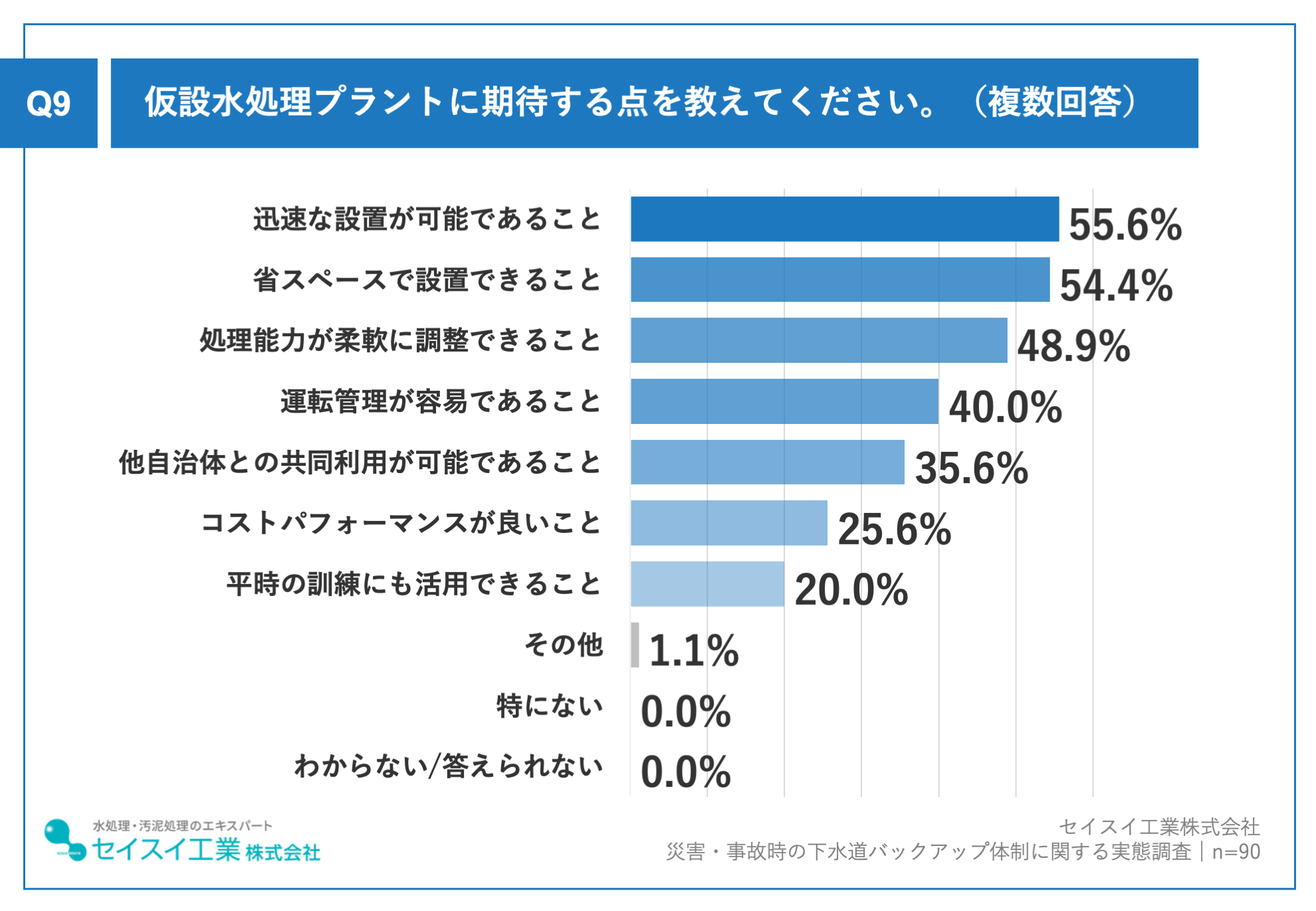 これらの結果から、多くの自治体がリスクの高さを認識しながらも、恒久設備だけでバックアップ体制を整備することには限界を感じている一方、仮設水処理プラントのような柔軟な選択肢には大きな期待を寄せていることが分かります。