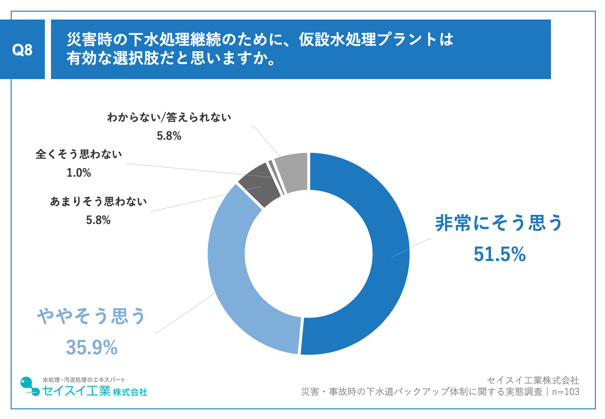 そのようななか、仮設水処理プラントの活用については高い関心が示されました。「災害時の下水処理機能停止に備える選択肢として有効だと思うか」という問いに、「非常にそう思う」が51.5%、「ややそう思う」が35.9%で、合計87.4%が肯定的に回答しました。[画像7: https://prcdn.freetls.fastly.net/release_image/58301/41/58301-41-59008b2286874c6b624d9f63e85ab2ef-1980x1371.png?width=536&quality=85%2C75&format=jpeg&auto=webp&fit=bounds&bg-color=fff ]