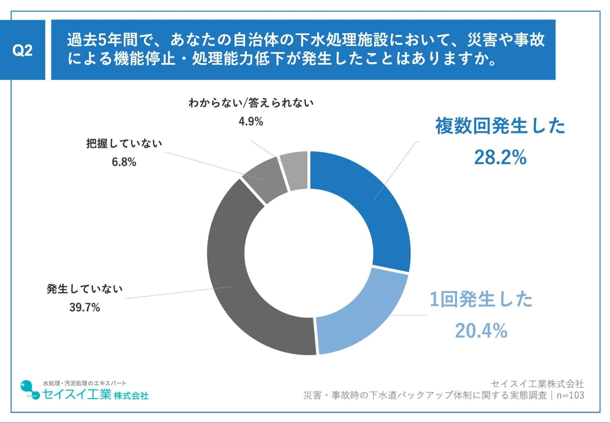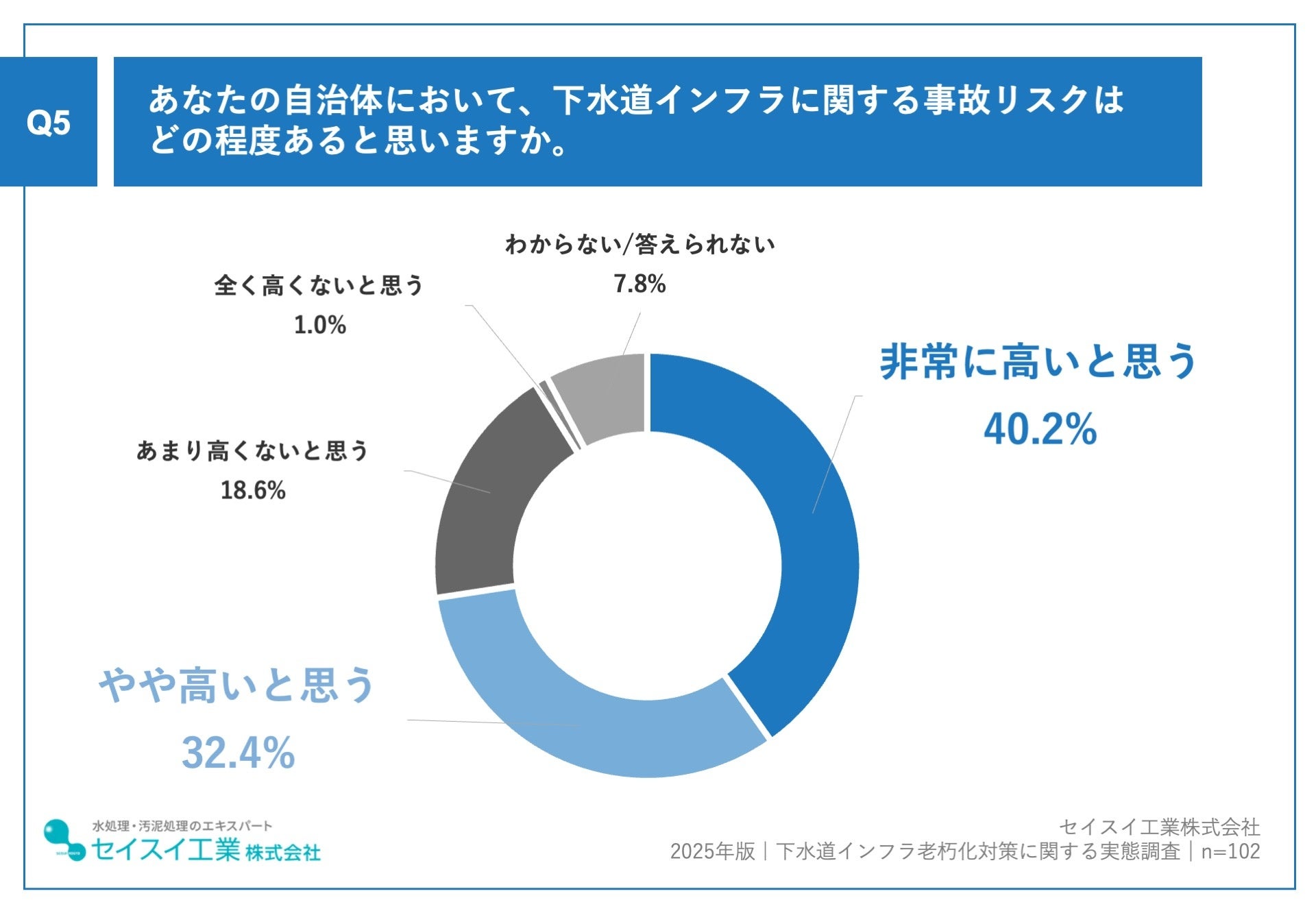 セイスイ工業は2025年、全国の自治体で下水道業務に携わる職員を対象に、「下水道インフラ老朽化対策に関する実態調査」「災害・事故時の下水道バックアップ体制に関する実態調査」の2つのインターネット調査を実施しました。前者は下水道インフラの老朽化対策の進捗状況を、後者は災害や事故時のバックアップ体制の整備状況を把握することを目的とし、それぞれ約100名の自治体職員から回答を得ました。高いリスク認識と整備の遅れ