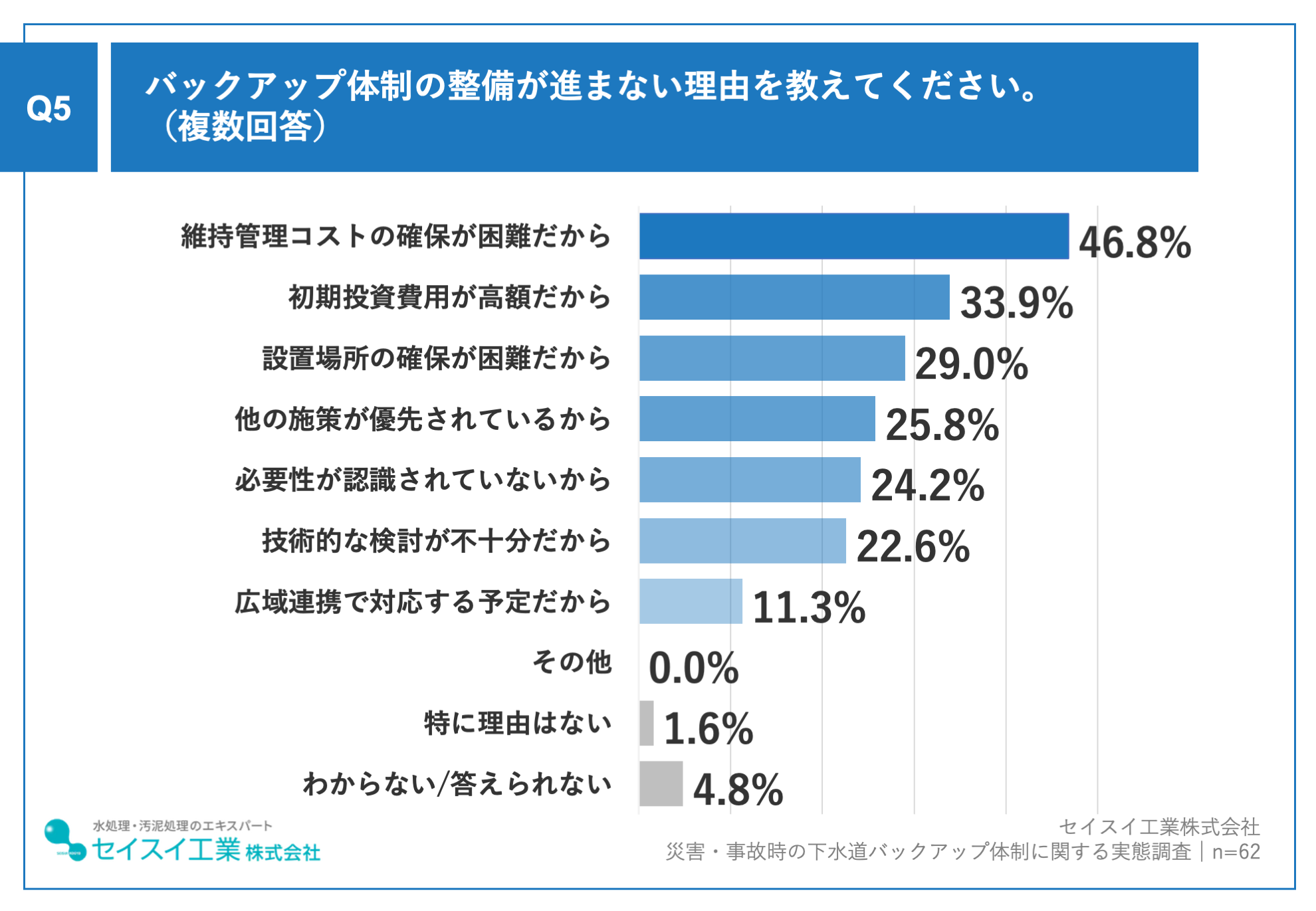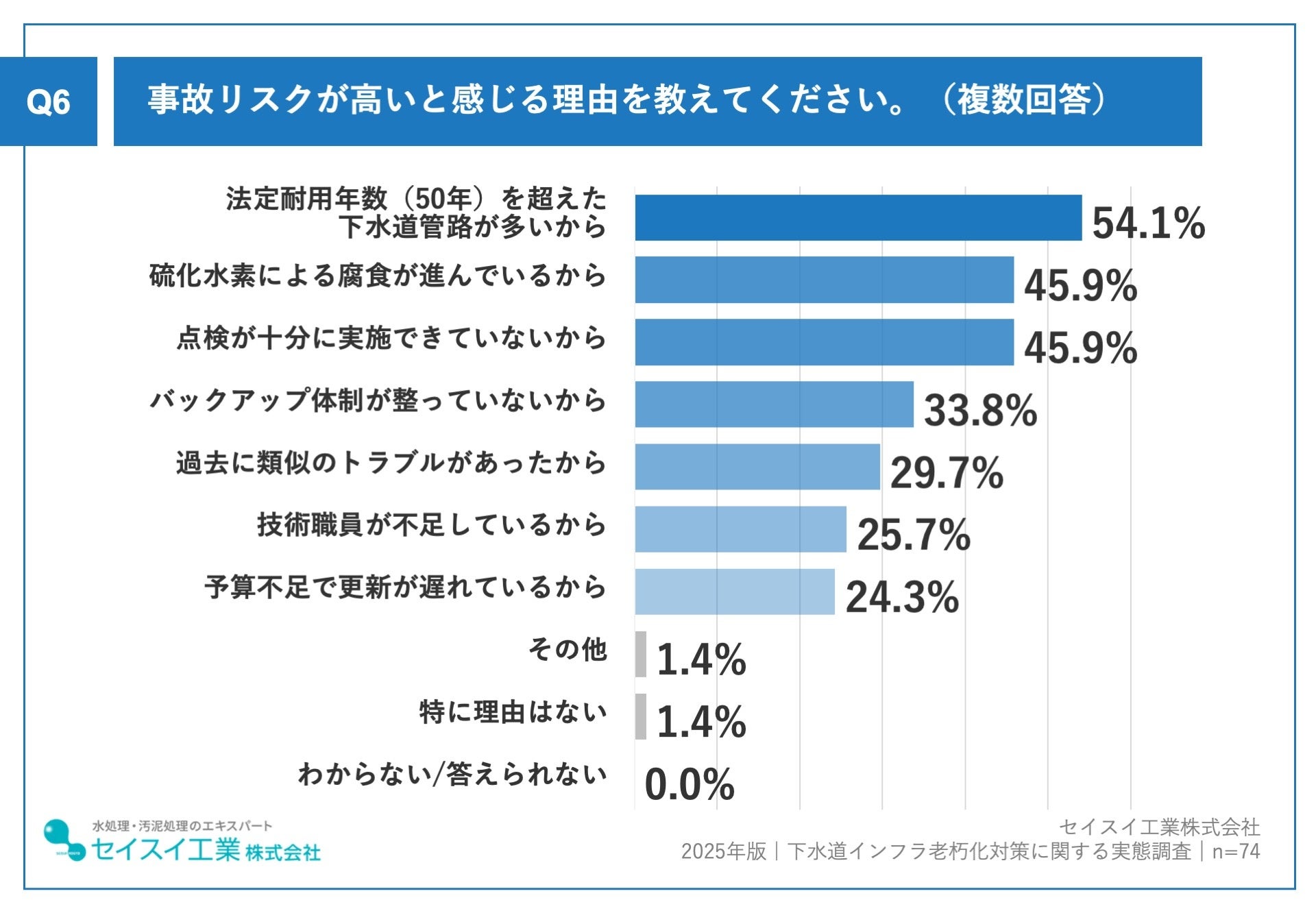 理由として「法定耐用年数(50年)を超えた下水道管が多い」(54.1%)、「老朽化による劣化箇所が増えている」(45.9%)、「バックアップ体制が十分でない」(33.8%)などが挙げられました。