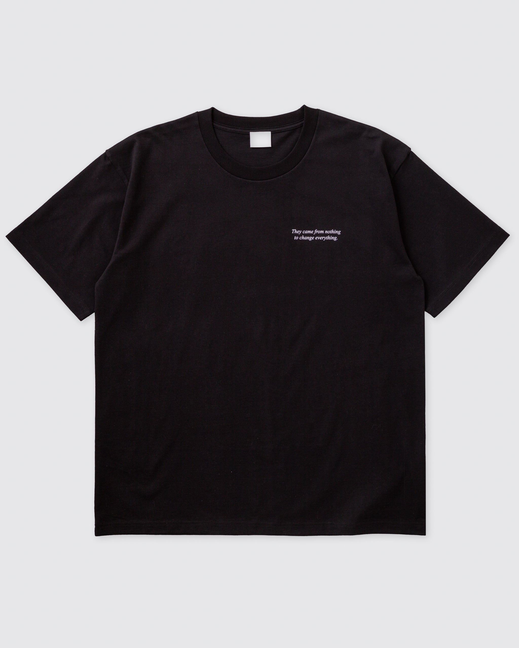 ボディ・生地はロゴTと同じものを採用し、フロントには、当時の映画公開時のコピー “They came from nothing to change everything.” のタイポグラフィをシルクスクリーンプリントで表現。バックには、夜のダウンヒルシーンの幻想的な街並みがボディに溶け込むよう、Tシャツの生地色を活かしたブラックマジックのインクジェットプリントを施しました。