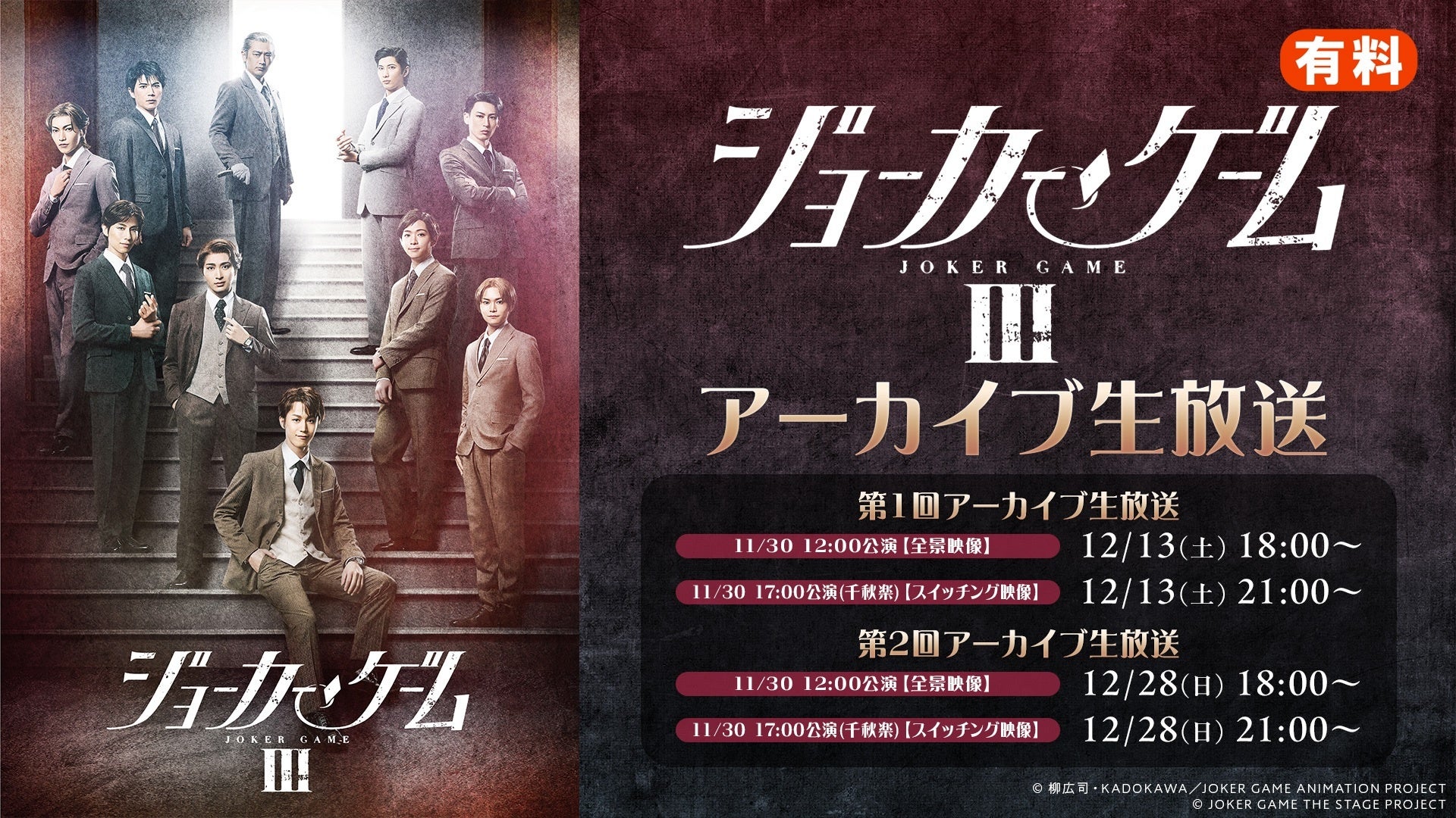 ニコニコ生放送では、舞台『ジョーカー・ゲームIII』の11/30(日)12:00公演・17:00公演(千秋楽)の全2公演のアーカイブ生放送をお送りいたします。