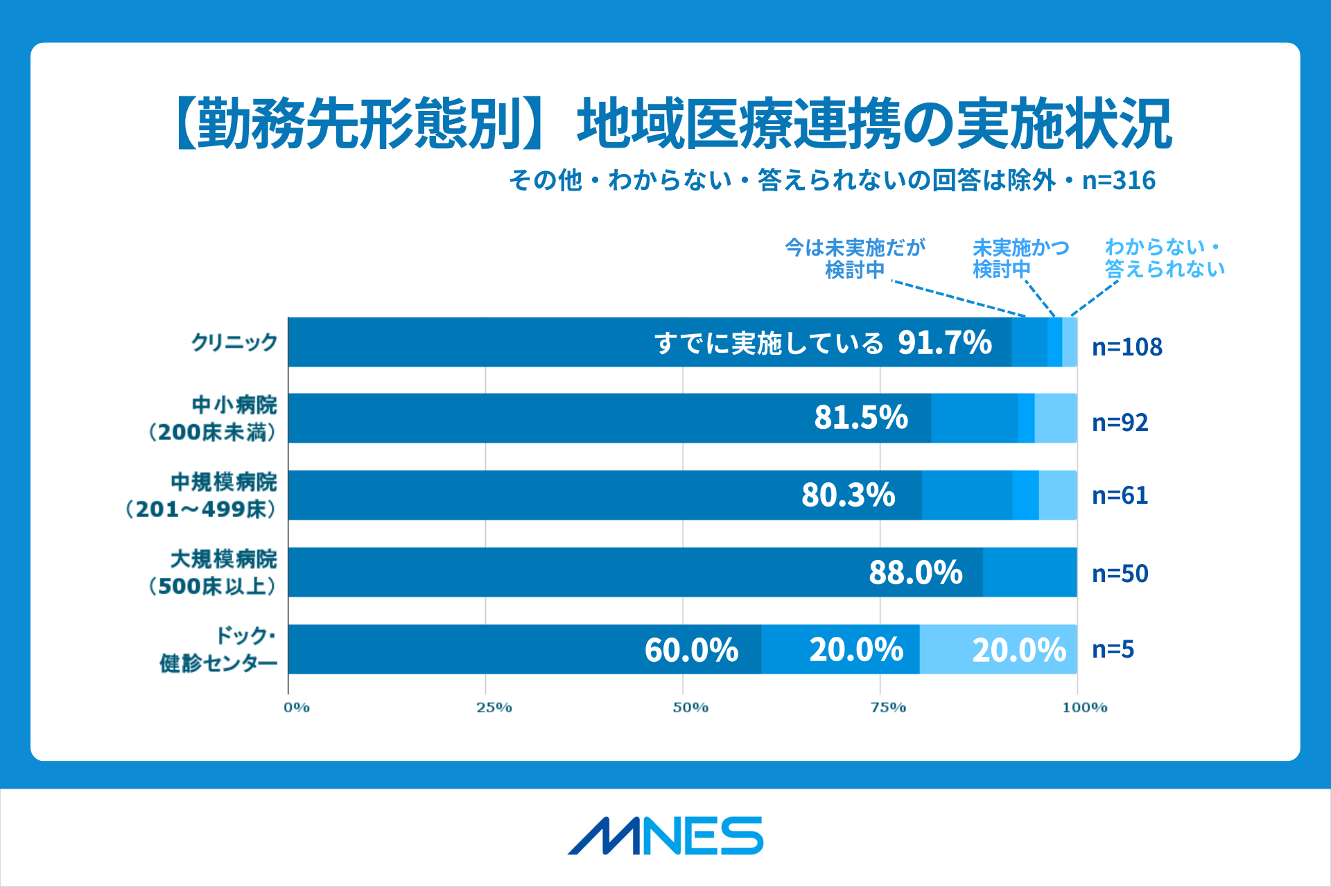 [画像3: https://prcdn.freetls.fastly.net/release_image/46248/61/46248-61-f4b0342dc0f355e1d70f0ebf4f94cbcb-1920x1280.png?width=536&quality=85%2C75&format=jpeg&auto=webp&fit=bounds&bg-color=fff ]勤め先の医療機関での地域医療連携の現況を質問したところ、全体では85.5%がすでに地域医療連携を実施済みと回答しました。さらに、地域医療連携を推進するための体制について最も当てはまるものをあわせて質問したところ、約半数が専任の部署や担当者が自施設内にいると回答する結果となりました。