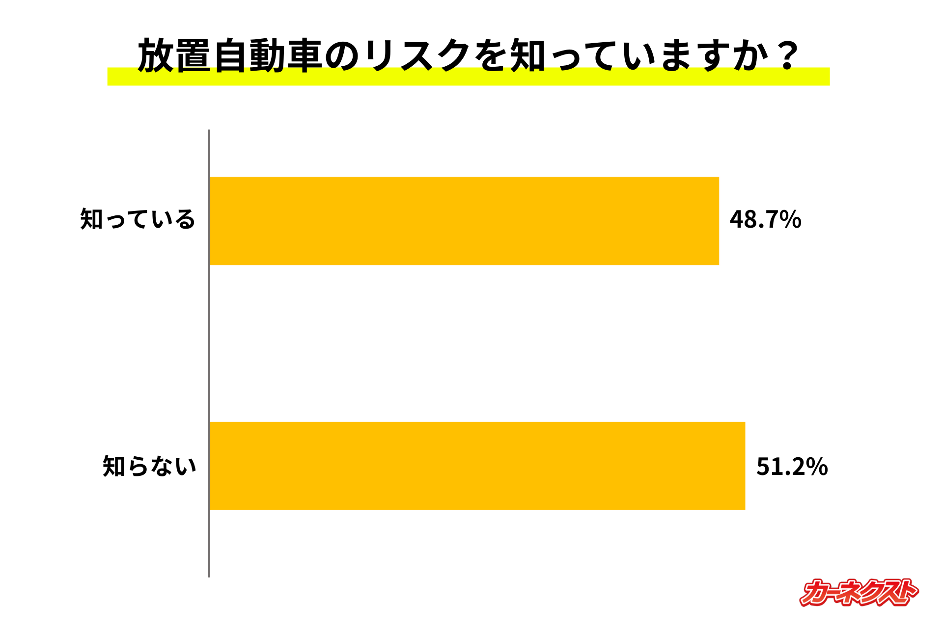 「放置自動車のリスク」を知っているか確認したところ、半数以上の51.2%が「知らない」と回答しました。
