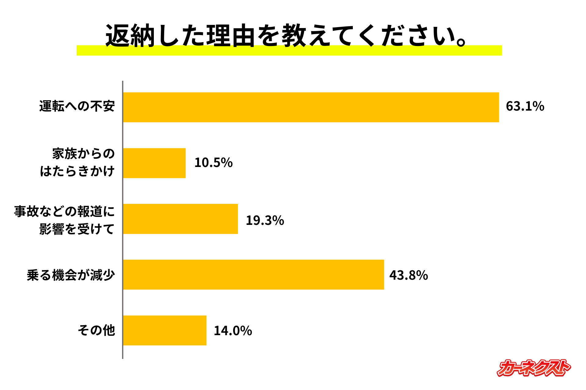 「返納した」と回答した人に、「返納した理由」を確認したところ、「運転への不安」が63.1%で最多となりました。次いで、「乗る機会が減少」が43.8%、「事故などの報道に影響を受けて」が19.3%と続きます。