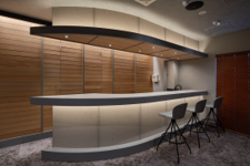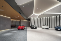 展示スペースの輪郭は円の形を成しており、天井は薄い不規則パネルを多層に重ねたデザインとし、間接照明の効果と相まって“浮遊感”を演出しています。随所に配置した間接照明で空間を幻想的に仕上げました。円形の中心に展示、周囲に商談室・オフィスを配した効率的な動線計画により、商品の存在感と体験価値を高めています。