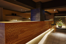 天下の台所、大阪の中心地に位置しながら、都市の喧騒から切り離された静けさを追求した割烹。カウンター正面には城壁を想起させる石垣、四季の草花、小滝と小川を配し、伝統的日本庭園の情景を室内に再解釈しました。内装には日本の伝統素材を随所に用い、日本の美意識への敬意を空間全体で表現しています。※現在は閉業。