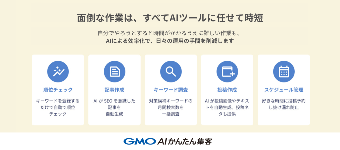 GMOインターネットグループのGMO NIKKO株式会社(※1)(代表取締役社長執行役員:佐久間勇 以下、GMO NIKKO)は、AIがSEO(検索エンジン最適化)対策、SNS運用を支援するWeb集客支援ツール「GMO AIかんたん集客」の提供を2025年12月11日(木)より開始します。本ツールによりWeb集客に取り組む個人事業主、中小・ベンチャーやスタートアップ企業は、専門知識やノウハウがなくてもAIのサポートを通じて、集客のための記事作成やSNS投稿に取り組めるようになります。これにより、マーケティング人材不足に悩む企業や組織でも、継続的な集客活動が可能になり、顧客獲得コストの削減と売上向上が期待できます。