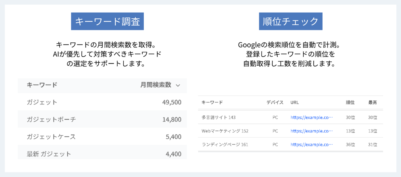 指定したキーワードおよび対策ページ(URL)のGoogle検索結果の順位を取得可能。これにより、SEO施策の効果を定量的に測定し、改善点を把握。順位取得パターンは毎日×10位まで、もしくは毎週×50位までのいずれかが選択可能。