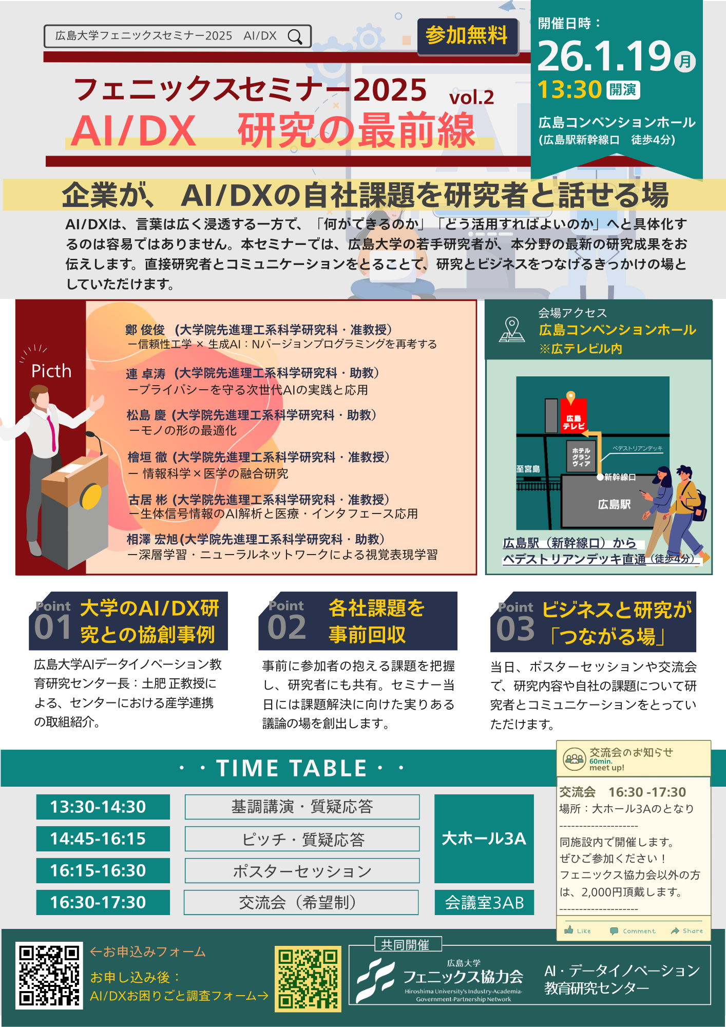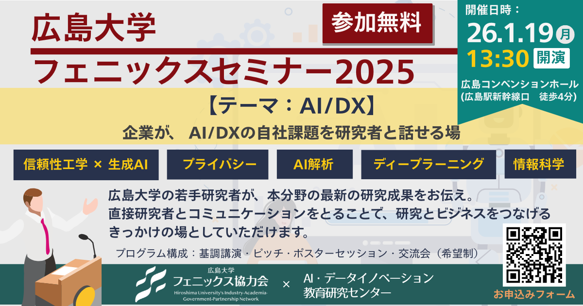 広島大学フェニックス協力会と広島大学AIDI教育研究センターが共催し、AI/DXをテーマとしたフェニックスセミナー(研究成果発表会)を開催いたします。