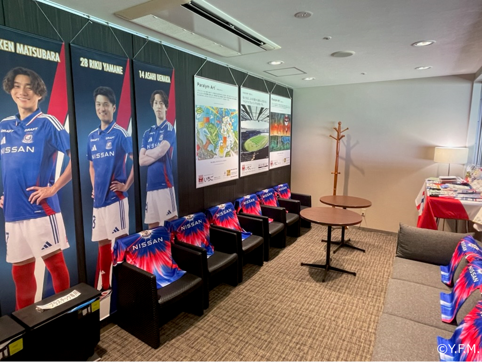 「いちごpresentsフレンドリールーム」には、落ち着いて過ごしていただきながらチームの応援を心から楽しんでいただけるよう、パラリンアートの絵画や、横浜F・マリノスのキャラクターのぬいぐるみやユニフォームなどで装飾しました。