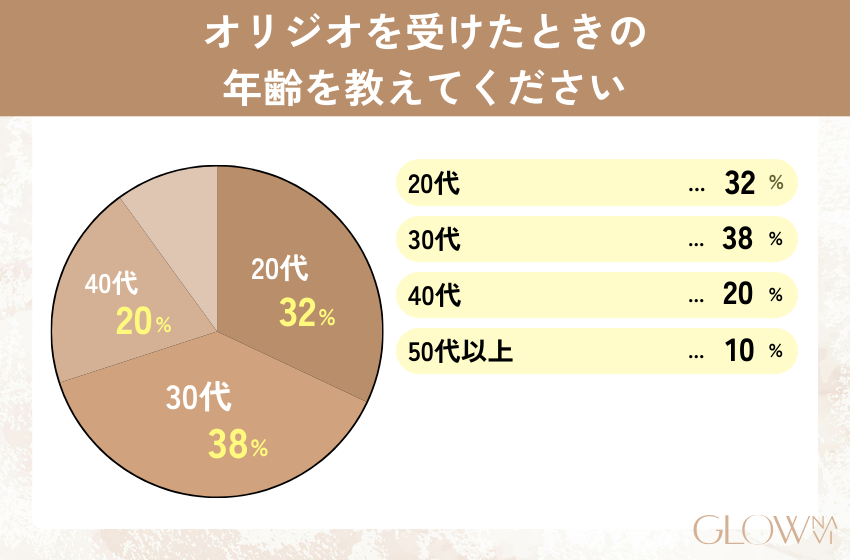 - オリジオを受けた年齢を「30代」と答えた人は全体の38%で最多