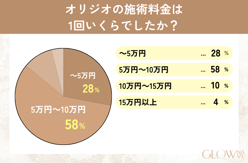 - オリジオの施術料金を1回「5万円~10万円」と答えた人は全体の過半数(58%)を占めた
