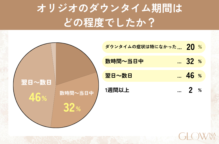 オリジオ施術後のダウンタイムについては、「翌日~数日」と答えた人が約半数を占めました。