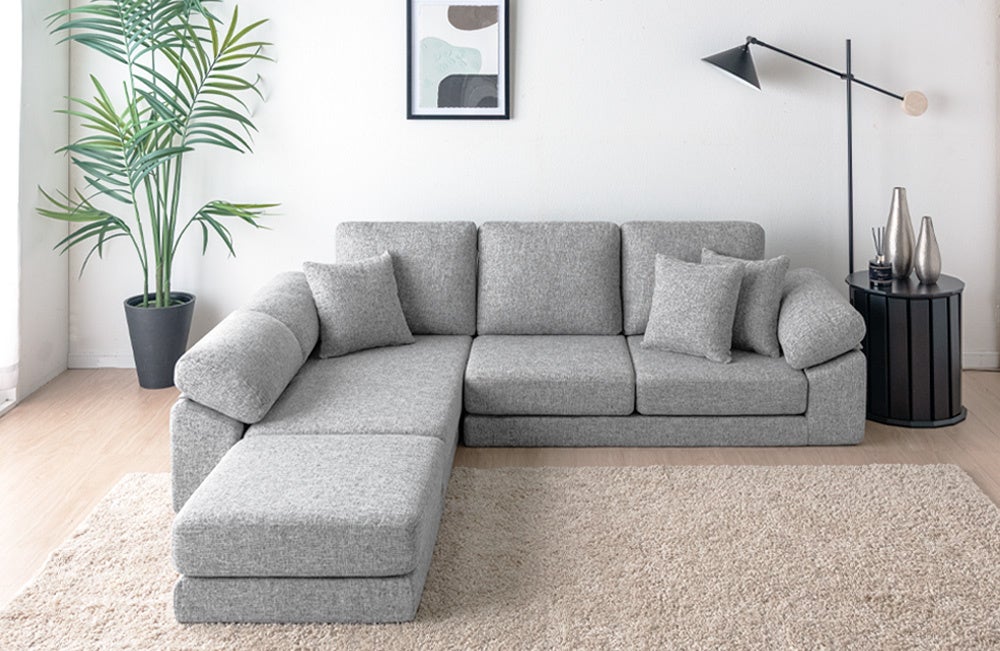正方形のオットマンが付属しており、リビングの配置やシーンに合わせてレイアウトを変えることができます。オットマンは左右どちらにも設置できるため、脚を伸ばしてゆったりくつろぐことができます。