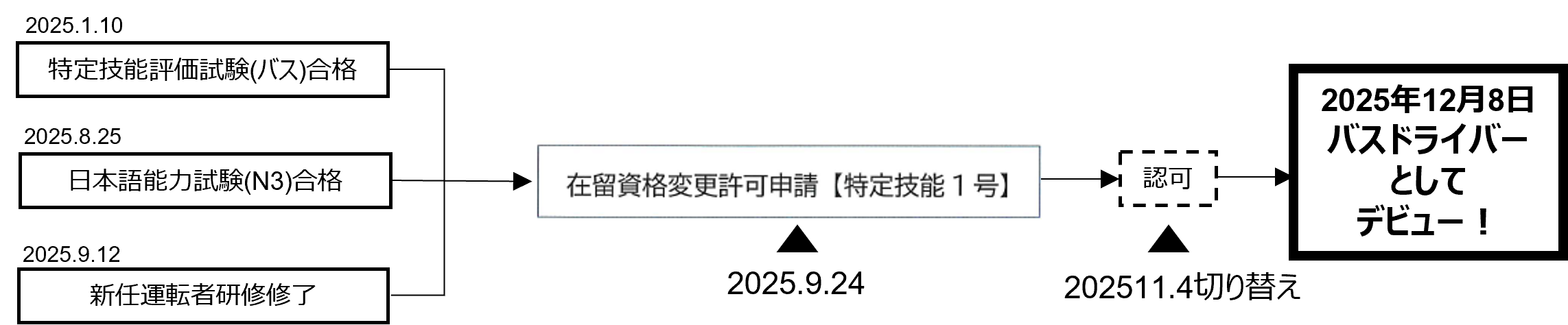 ※日本初:特定技能評価試験(バス)合格第1号、日本バス協会からの新任運転者研修終了証交付第1号を経て、他社において当制度下のデビュー実績が無い(自社調べ)ことから日本初としています。