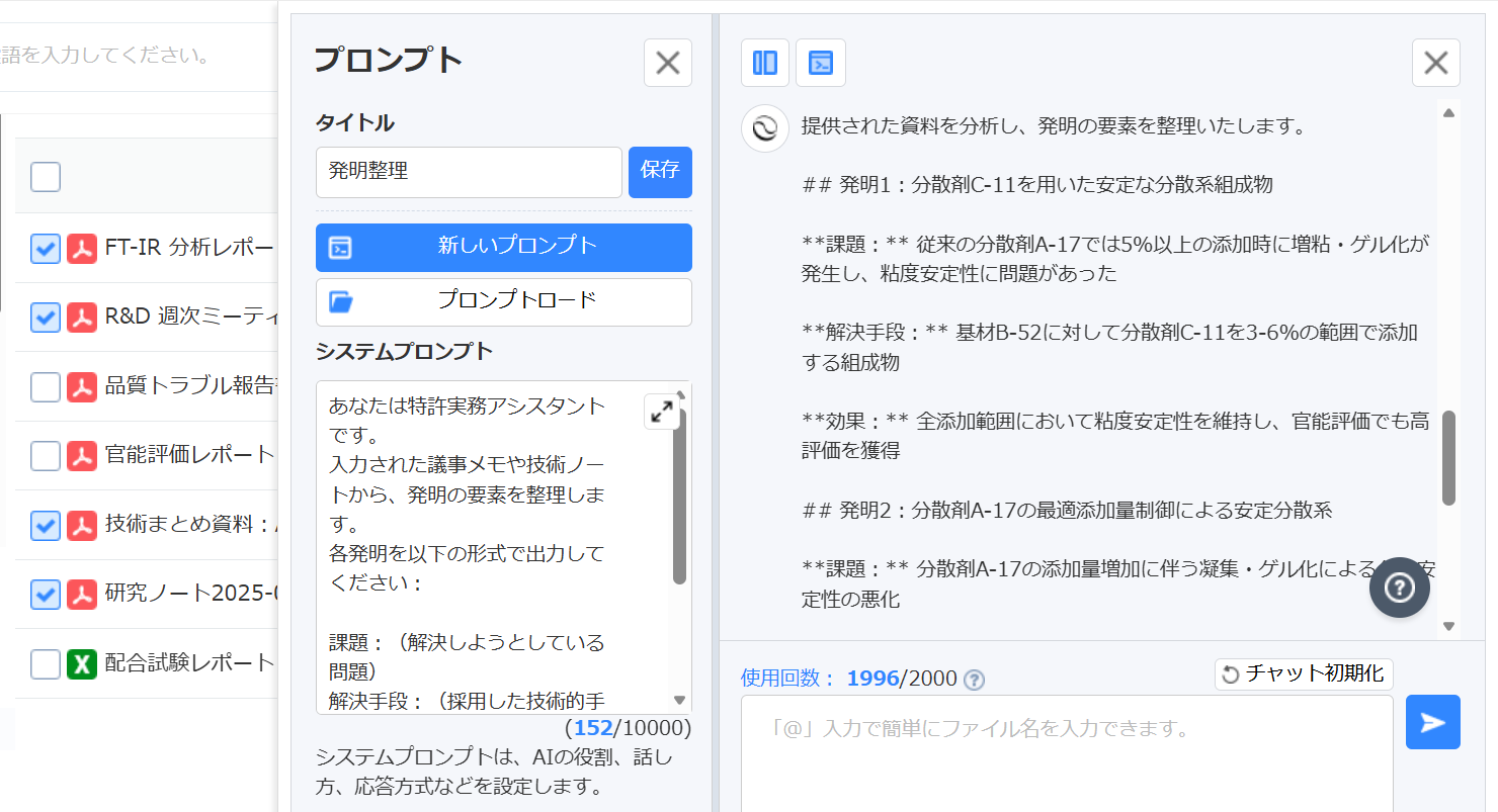 AI IPGenius は、研究ノート・試験レポート・設計資料・品質データなど、非構造データを横断解析する仕組みを備えている。化学R&D領域で求められる条件別のログ抽出や、材料の組み合わせから技術ポイントを把握する用途に対応する。複数資料を組み合わせた技術シーズ抽出、過去実験との関連把握、類似技術検索にも利用できる。