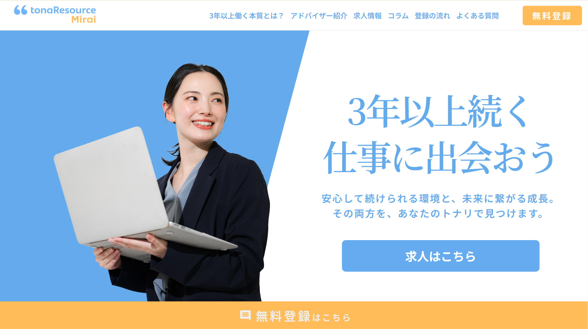 近年、転職が身近な選択肢となり、早期離職を選択するケースが増加しています。厚生労働省の集計では、大学卒の就職後3年以内離職率は33.8%、高校卒は37.9%と、約3人に1人が3年以内に離職しています(出典:厚生労働省「新規学卒就職者の離職状況」令和4年3月卒業者)。合わない環境から離れることは一つの選択肢である一方、短期離職の繰り返しはスキル形成や市場価値に不利に働く場合があります。トナリズムが運営する既存の転職支援サービスでも、「短期離職が理由で書類選考が通らない」という悩みを抱える求職者が少なくありませんでした。一つの環境で3年以上働き、一通りの業務を経験することは、再現性のあるスキルの獲得や市場価値の向上に直結します。そこでトナリズムは、目先の転職だけでなく、“3年以上働ける環境”にこだわり、キャリアの土台となる期間をしっかり築けるよう支援するため、トナリソースミライを立ち上げました。