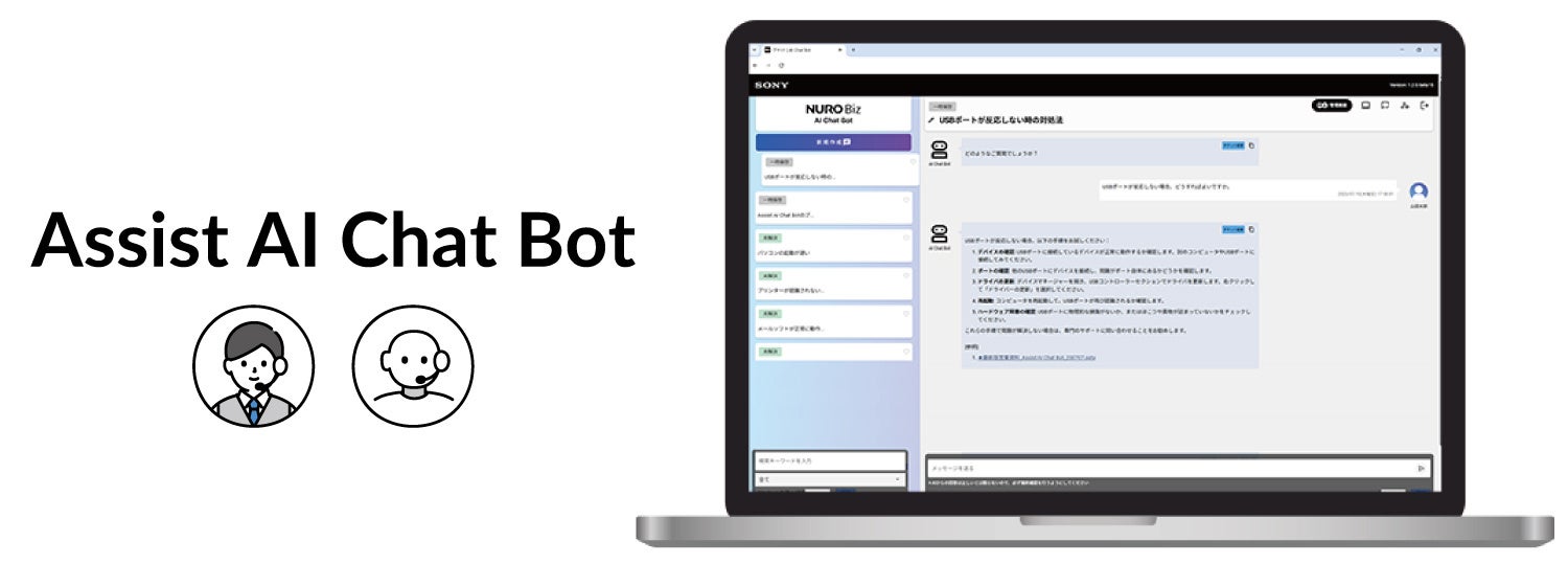「Assist AI Chat Bot」は法人向けICTソリューションブランド『NURO Biz(ニューロ・ビズ)』のサービスで、情報システム部門(以下、情シス)のバックオフィス部門に寄せられる従業員からの社内問い合せに対して、窓口担当者に代わってAIが対話形式で解決をサポートします。